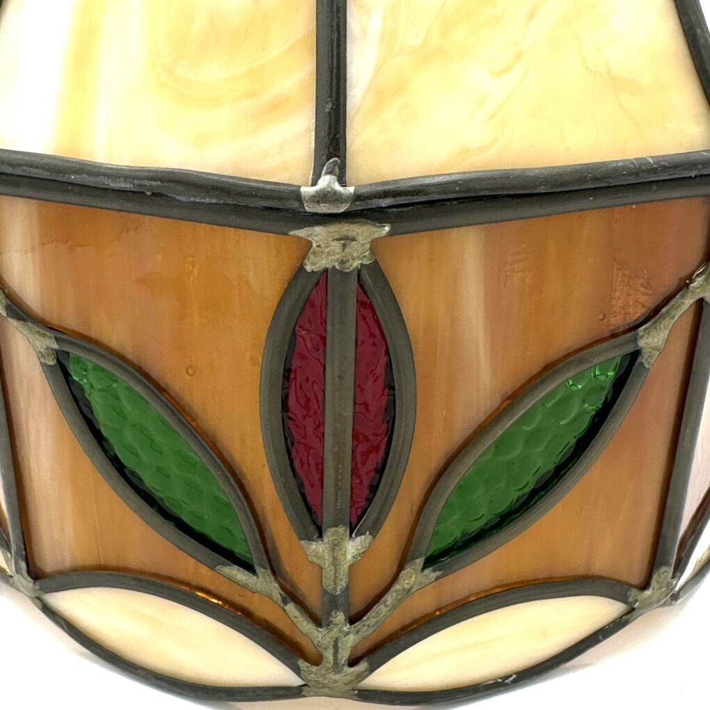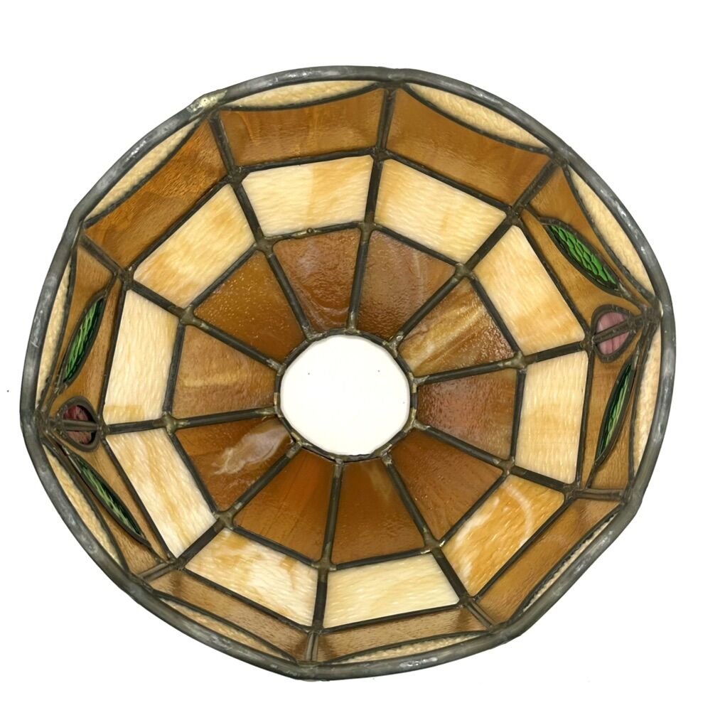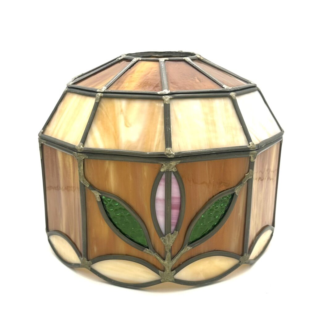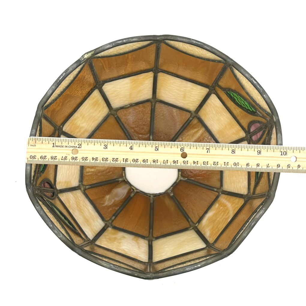 This is a Tiffany style stained leaded glass tulip hanging lampshade. The diameter across the bottom is about 10 inches and it is about 8 inches in height with the opening on the top at 3 inches. It is a beautiful condition with no chips or cracks. It doesn’t come with any hardware.