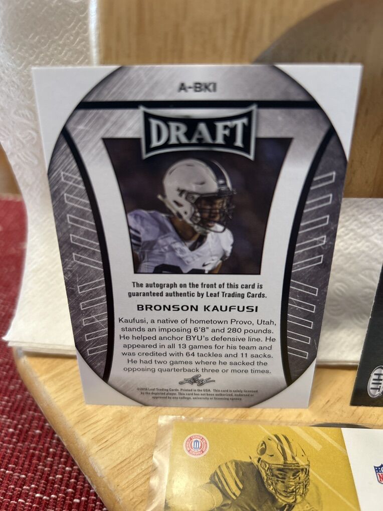 (1) Bronson Kaufusi Rookie Card LEAF BYU DRAFT RC Autographed Football Card Hand Signed.
