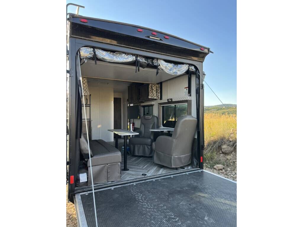 Nearly brand new, 2022 2113 Toy Hauler! Used only 5 trips. Full Solar, 75 Gen Hours!