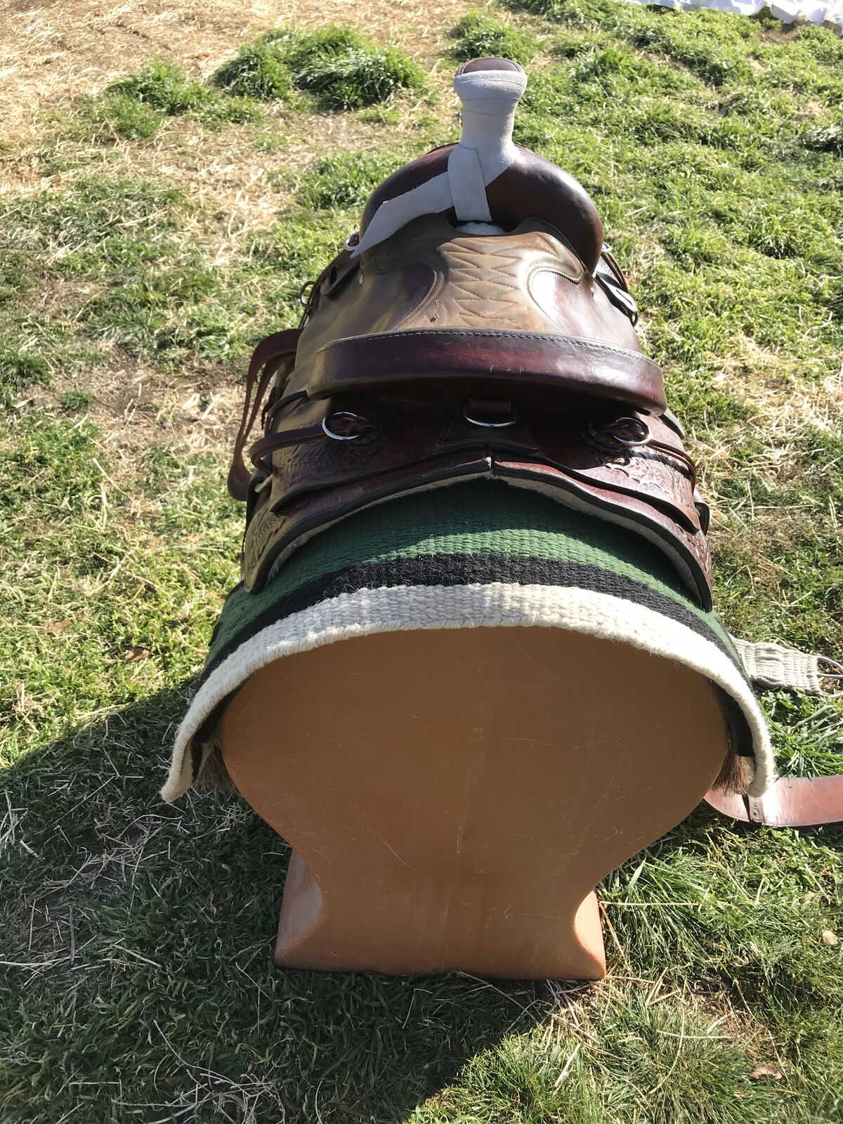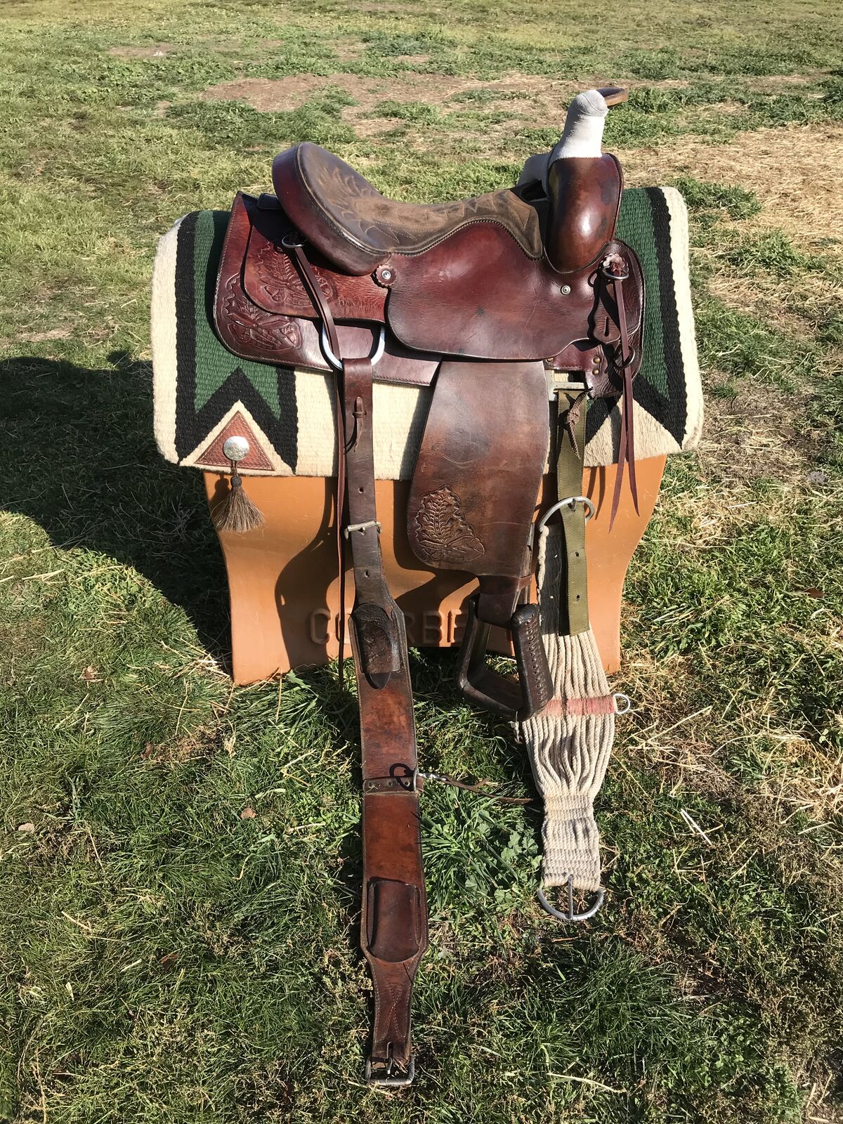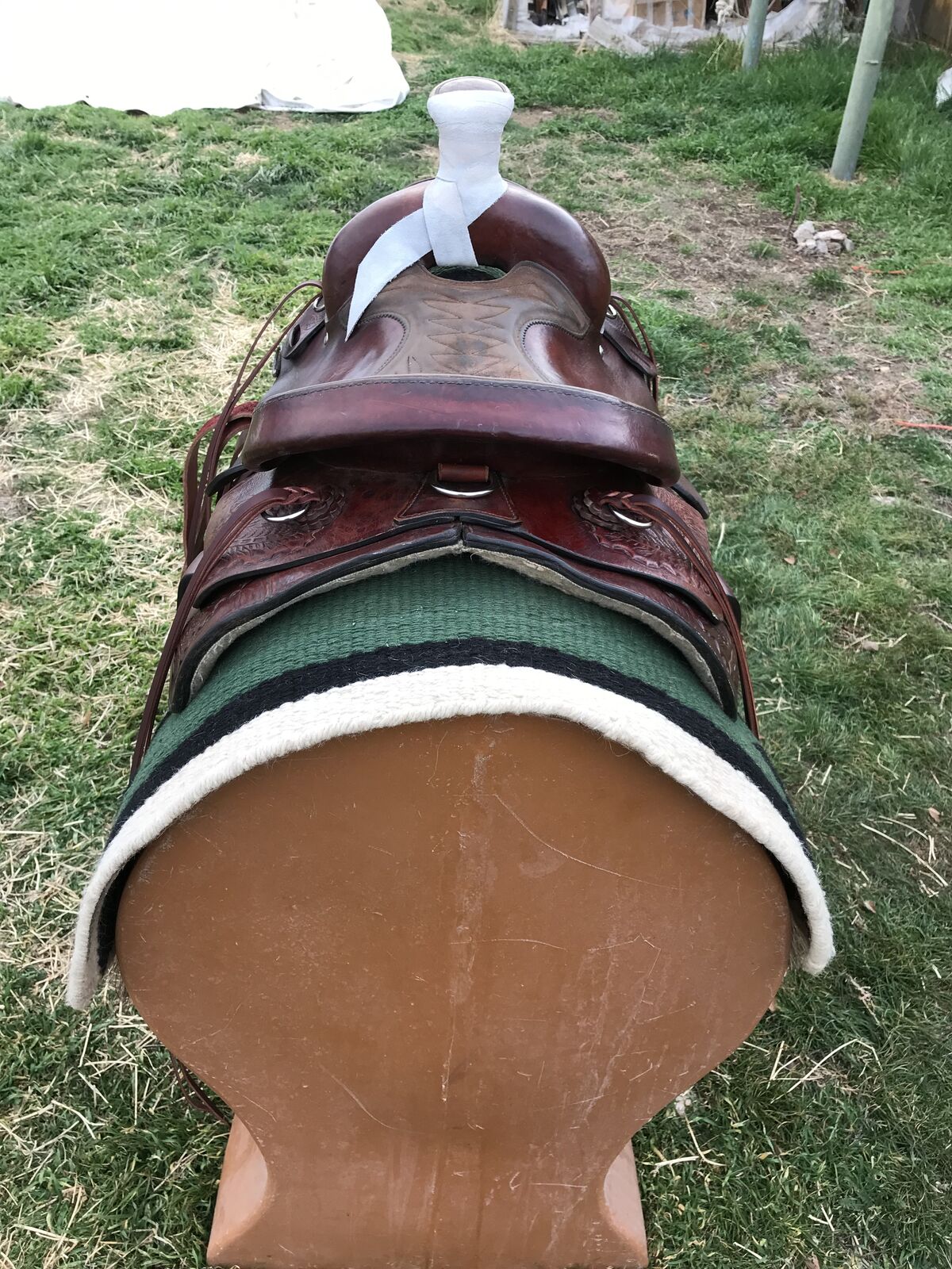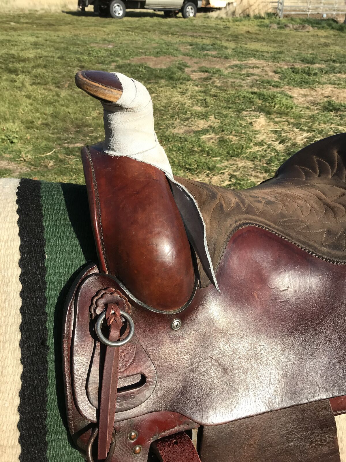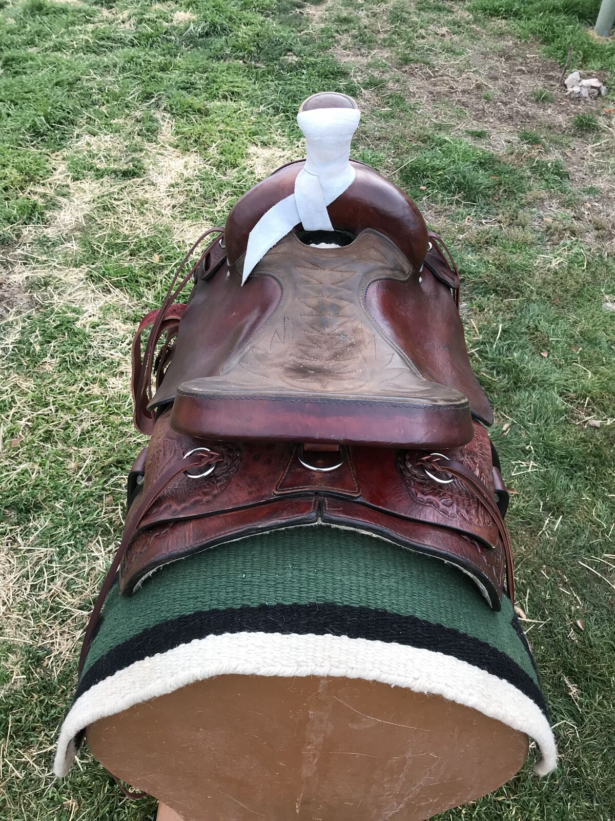 VenmoThis used roping saddle comes with front and back cinches, and is ready to throw on a mount. It is in great condition and still has a little bit of new-saddle squeak. The saddle features a padded seat, and strings and rings in the front and rear To clip and tie your gear on. The rear strings are long enough to tie on your bedroll, tent, and rain slicker. I put on a new mulehide horn wrap to protect the horn cover. The horn is perfect underneath. The gullet measures 8.5". The cantle is 3.5" high. This would be a great hunting/mountain/trail saddle.