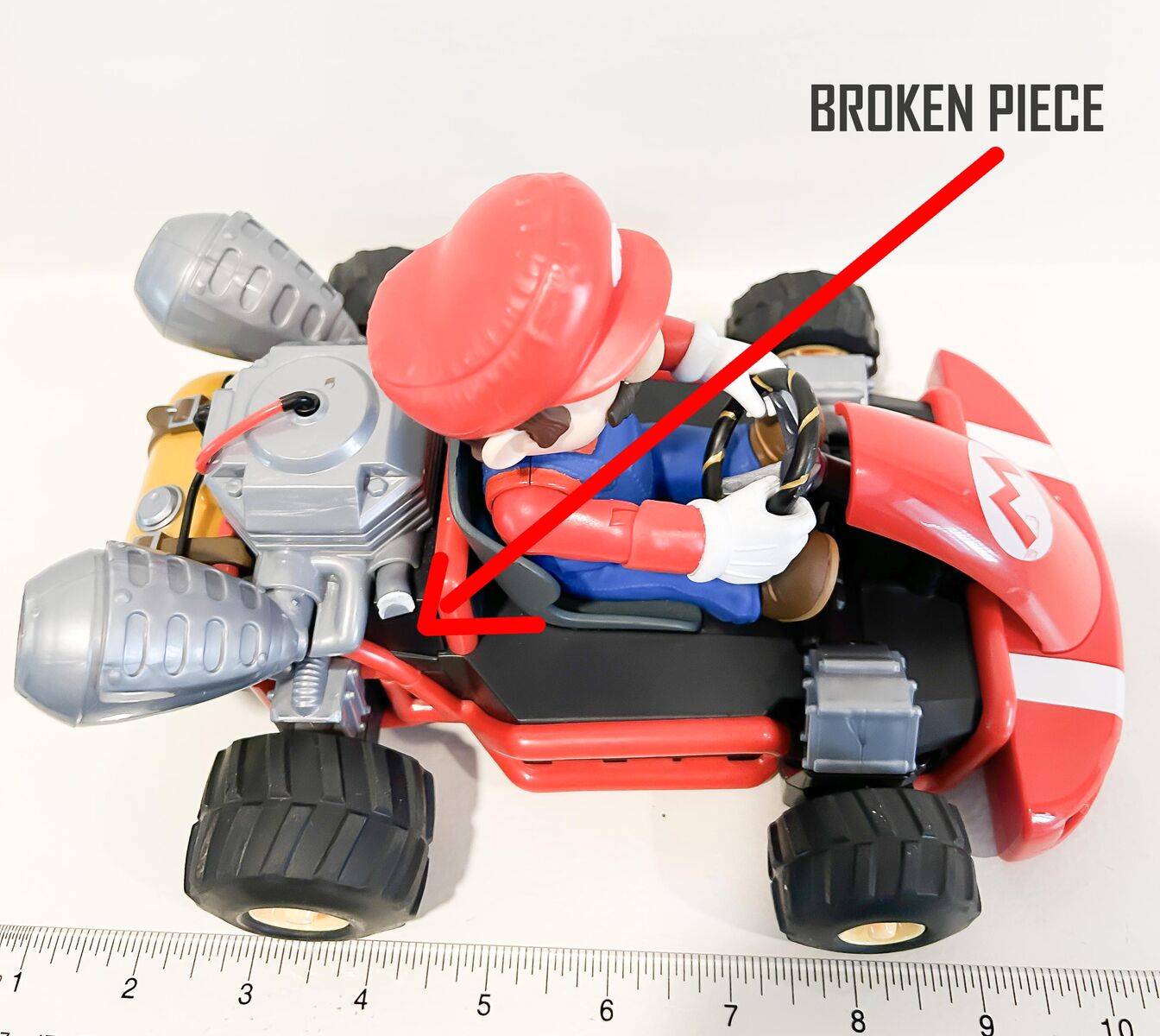 VenmoIt works, but it has a small piece broken. Comes with the remote. It is difficult to get it to turn the wheels while in motion; wheels turn fine when not moving though.