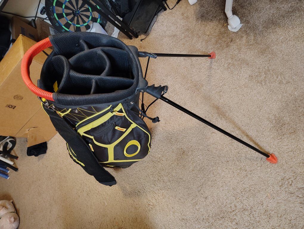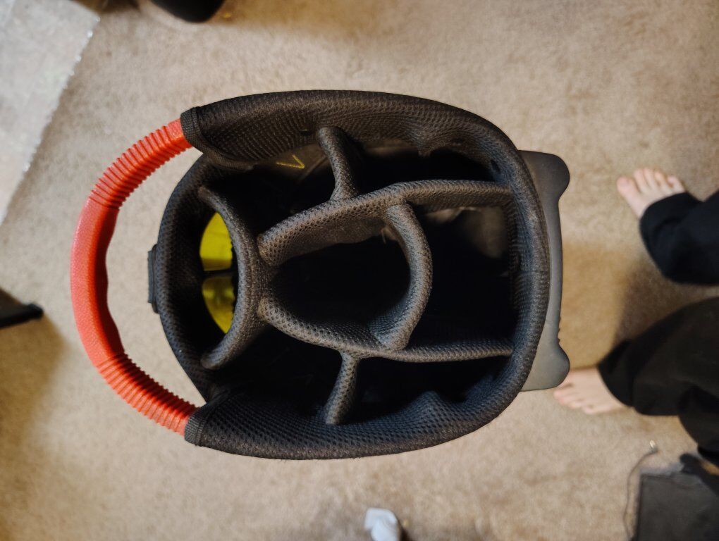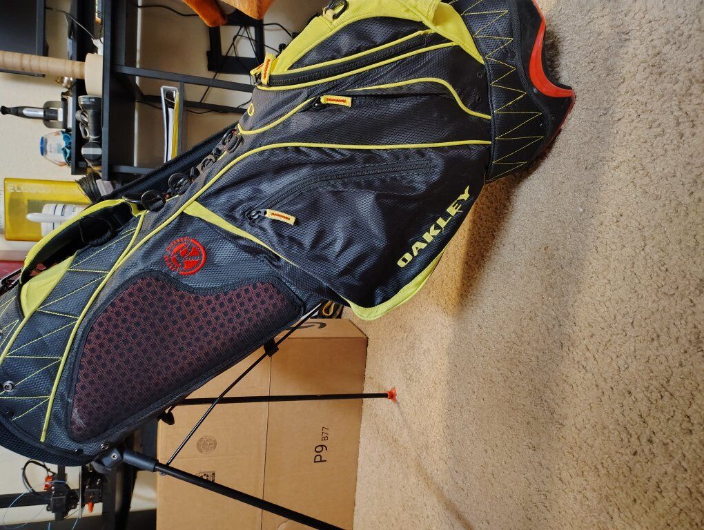 ZelleOakley 7 divider stand gold bag, includes a strap I got to carry it and some balls and tees in the pockets, maybe a divot tool.