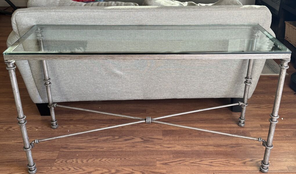 VenmoStyled after the Giacometti era, this sofa table has a brutalist wrought iron base with 3/8” thick glass top.