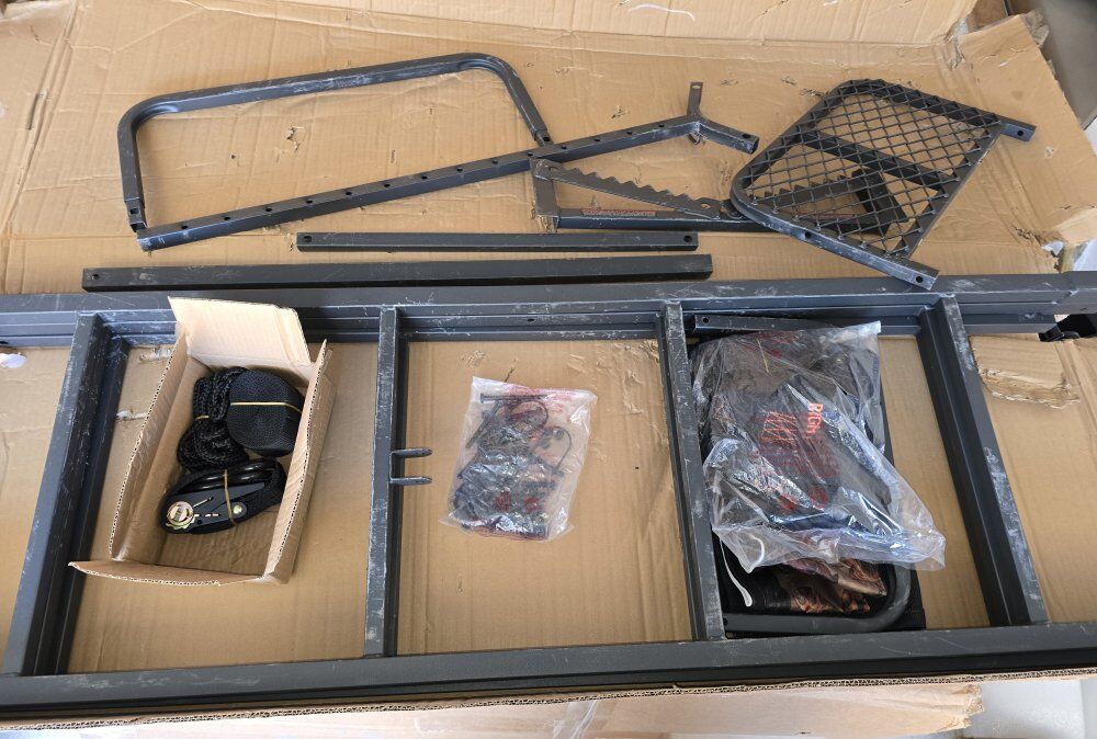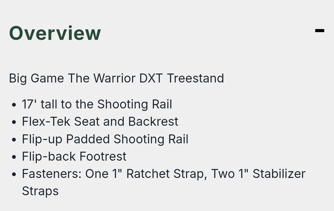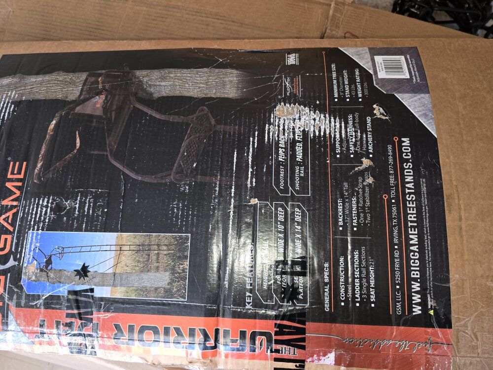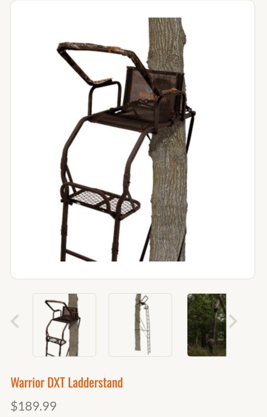 from the manufacturer: The Big Game Treestands Warrior Elite Ladder Tree Stand features a padded flip-back shooting rail, flip-back footrest, and a flip-back Flex-Tek seat and backrest. The tree stand also includes (1) 1 in. ratchet strap, (2) 1 in. stabilizer straps, and (1) full-body fall arrest system. If you are looking for a stand to keep you comfortable on those long sits, look no further than this ladder tree stand. With a padded flip-up shooting rail and a foot rest for added comfort, the tree stand is the choice for the serious hunter.