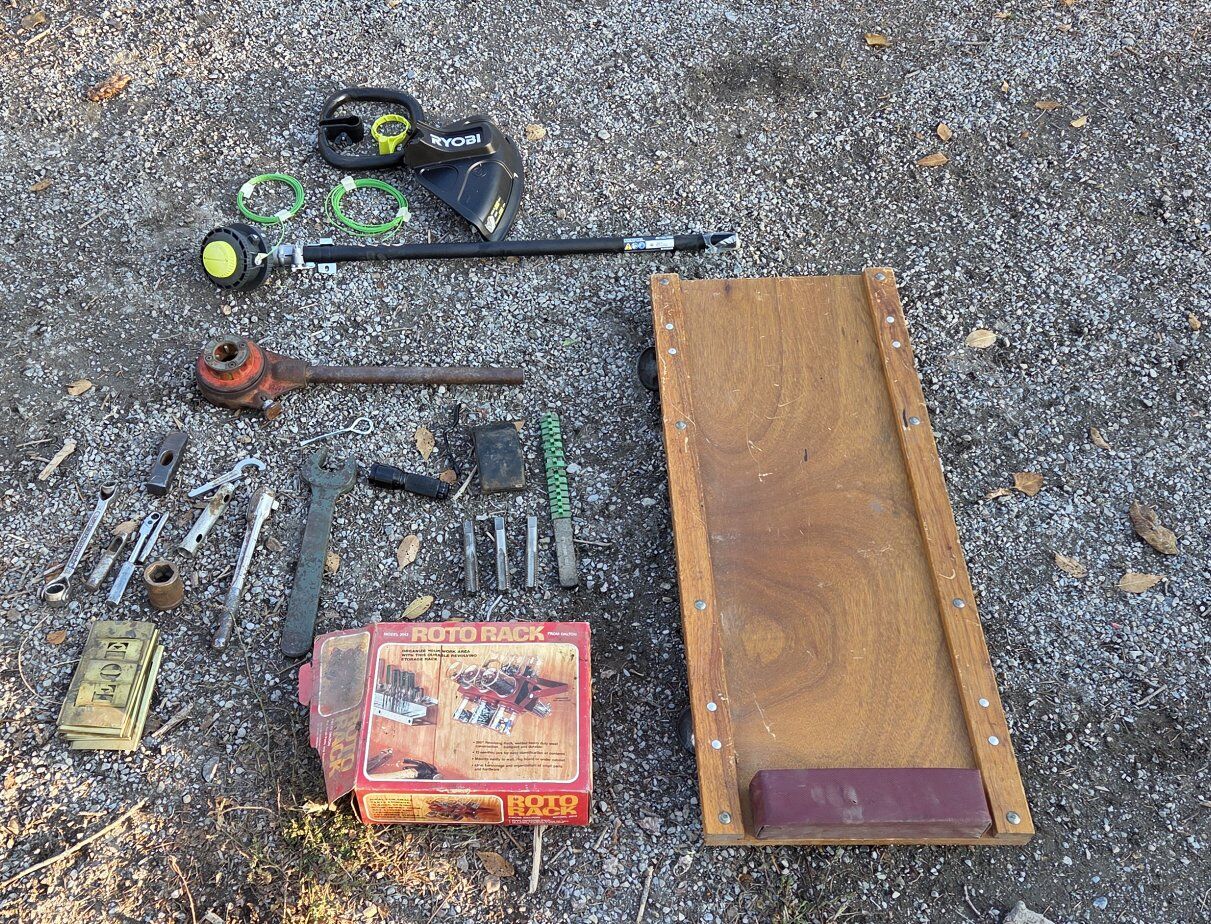 PayPalRandom tools, Ridgid 3/4 pipe threader, Ryobi trimmer, Williams socket, 7/8 Greenfield tap, 7/8 Butterfield tap, 7/8 NBM Co tap. ratchet, hammer, brass stencils, creeper, sanding block, etc. What you see is what you get. $30 takes it all. Sold as is.