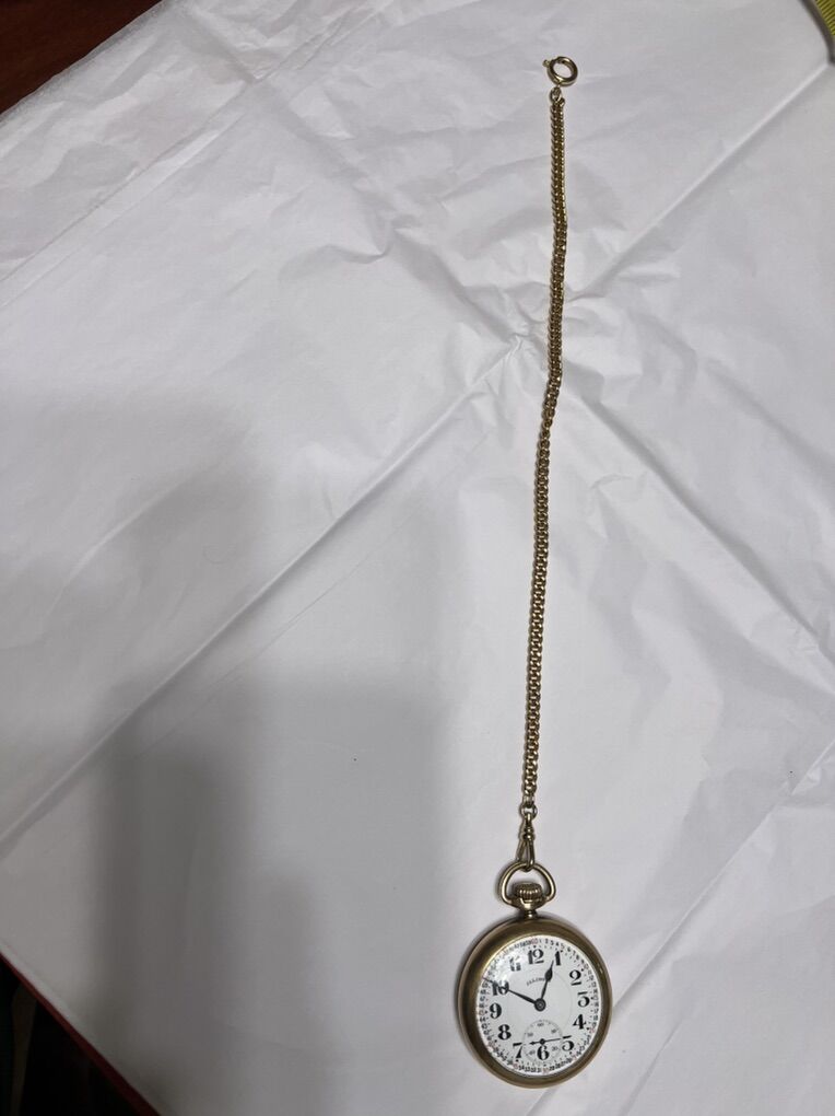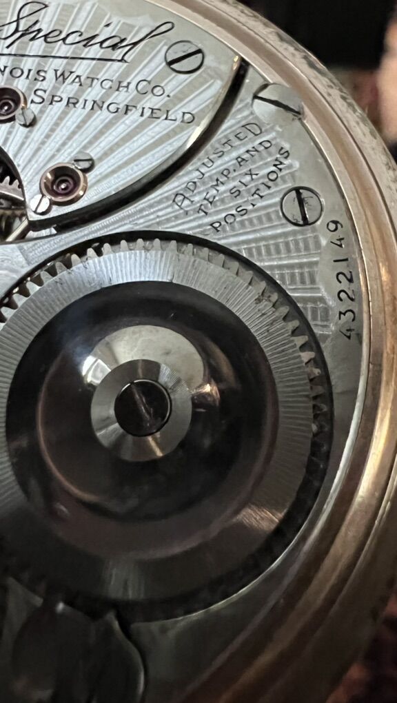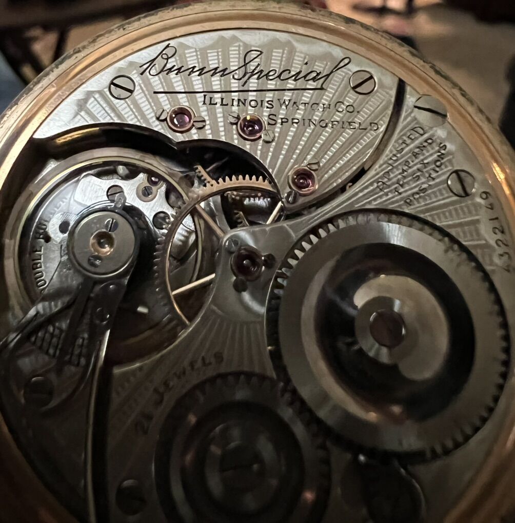 Illinois Bunn Special pocket watch and chain. The Bunn Special was a renowned line of high-grade, railroad-standard pocket watches manufactured by the Illinois Watch Company in Springfield, Illinois. Illinois Watch Company, based in Springfield, Illinois. Bunn Special, which was their most famous railroad watch grade, designed for exceptional accuracy required for railroad time service. The movement features a distinctive sunburst or ray pattern damaskeening on the nickel plates. It typically features high-quality components like ruby jewels (often 21 or 23 jewels), a micro-regulator, and gold settings.