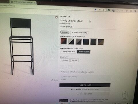 PayPalI have 3 Barstools for sale for $625. My Bar Stools sell for $650 a piece. They have been stored in my family room. These barstools would make a great gift. Excellent Condition!