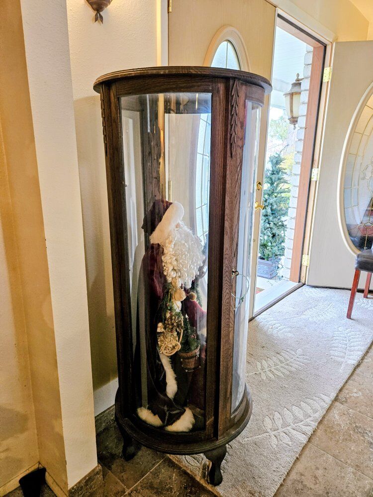 Beautiful cylindrical dark wood and glass curio cabinet with lock and key. Dark finish, cabriole legs. No shelves, but does have pegs for them. Excellent condition. Includes Christmas Santas decor inside. Would make a great Chistmas gift!