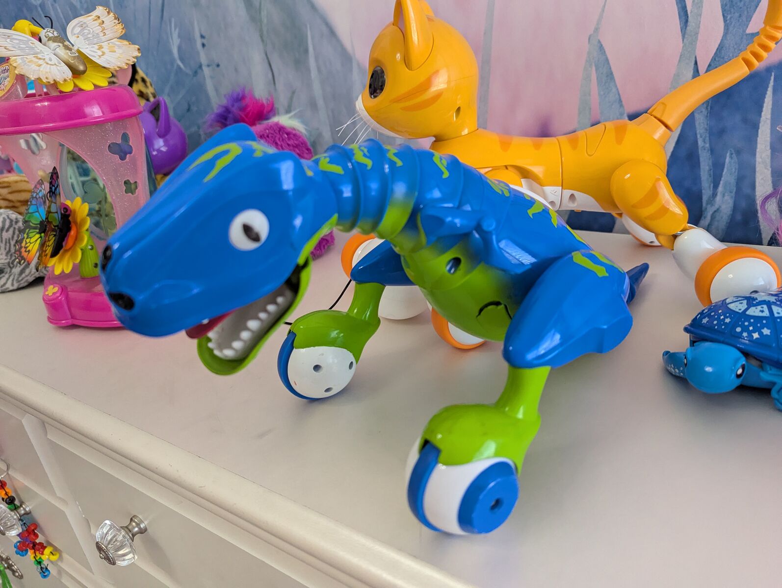 -Zoomer Kitty Yellow Tabby Interactive Cat - $40 (this goes for a lot of money on ebay). This is a rolling robot cat. It responds to petting, interacts with toy ball, dances, sings, trains.