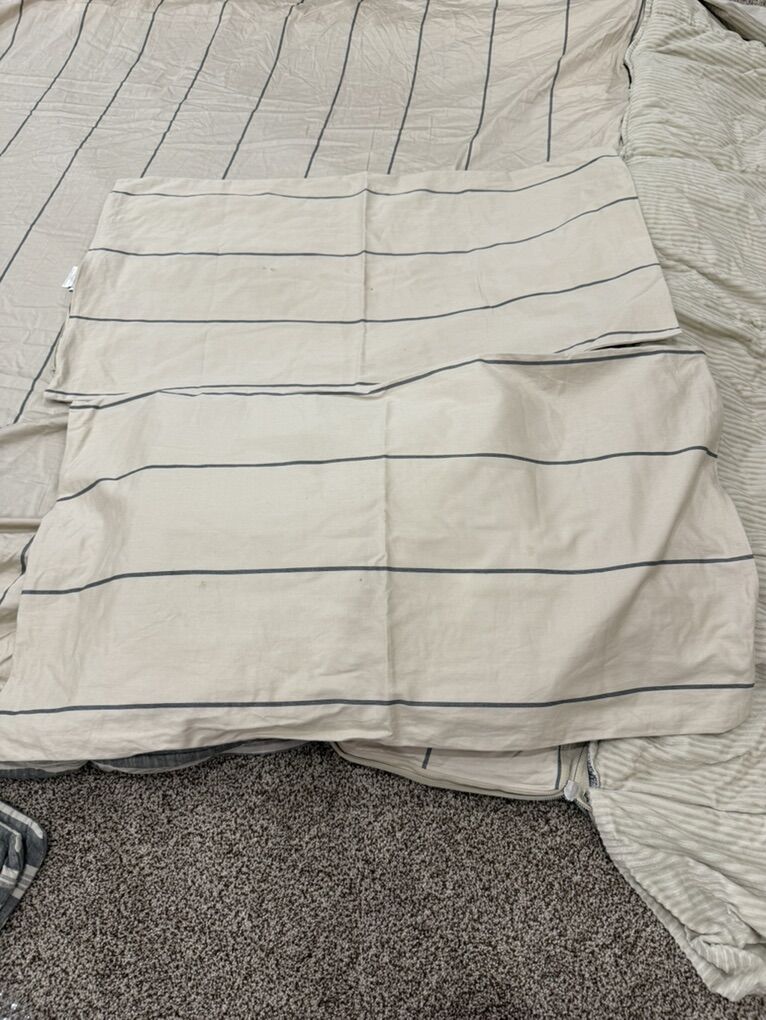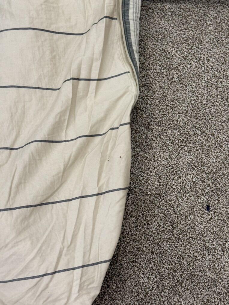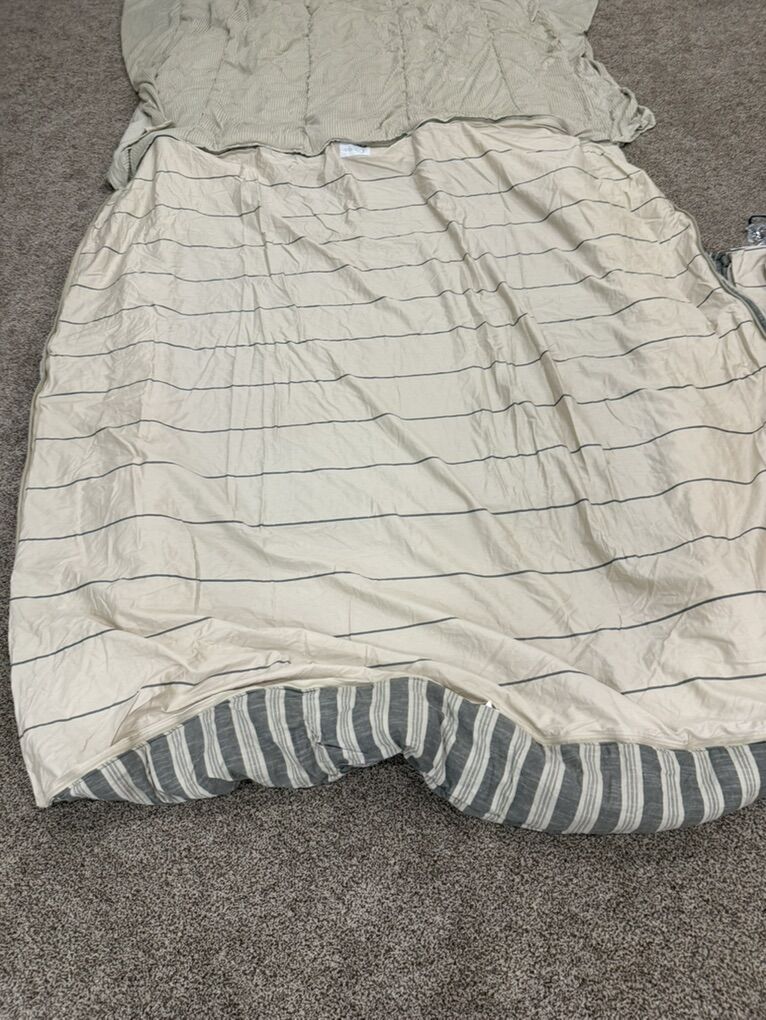64NOV. King Sawyer Minky Zipbase. Top has some bunching of fabric/minky bunched in back same spot. Some signs of use on one set and 2 pillow cases. Includes 2 shams and 2 cases and 2 sheets.