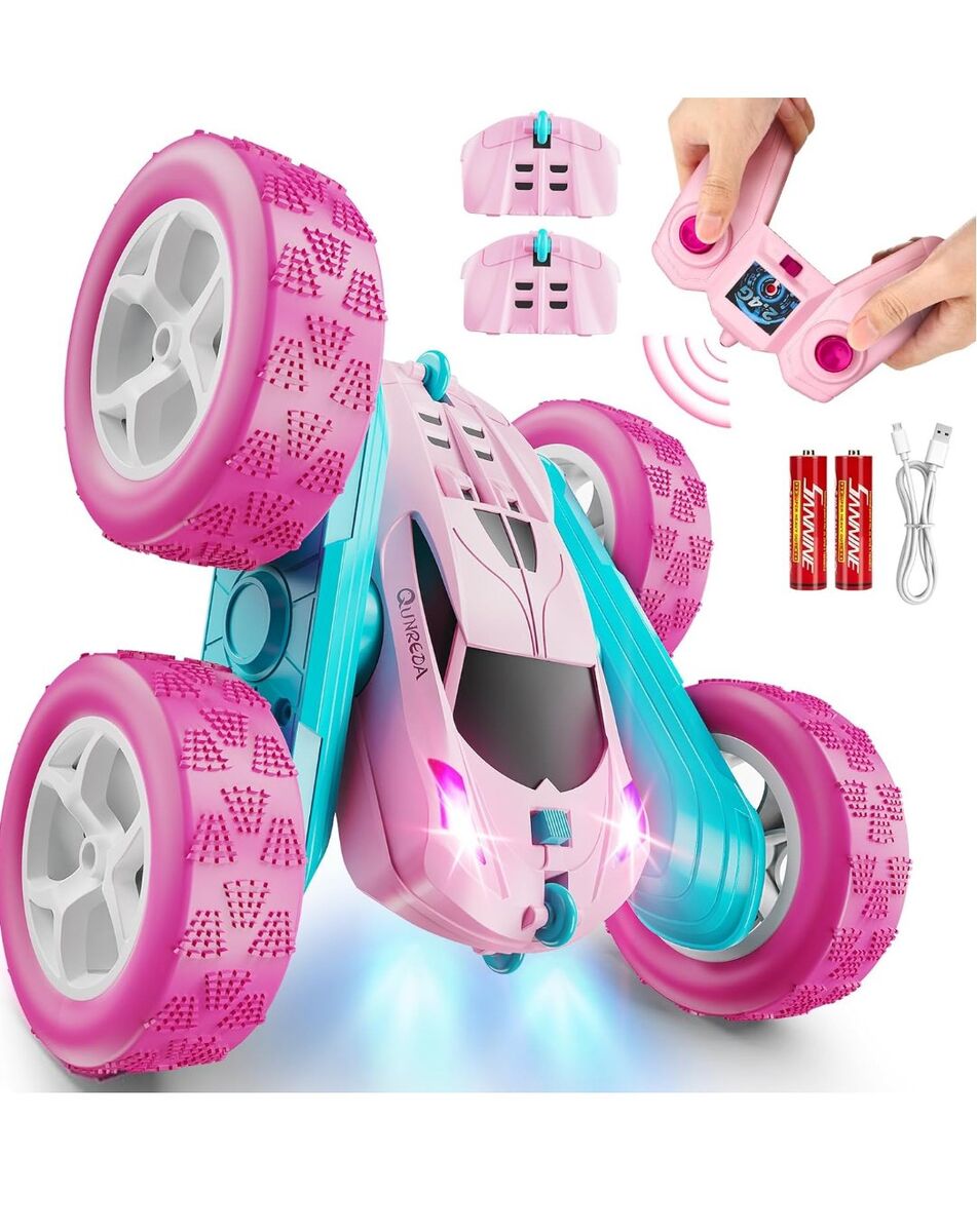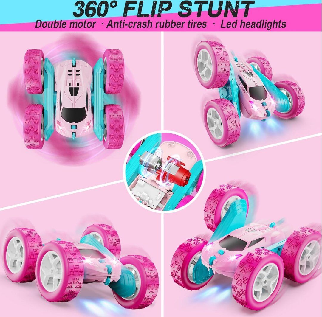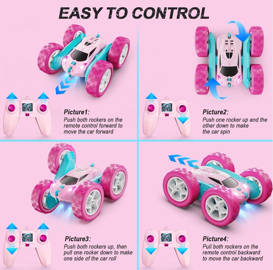 VenmoThis pink remote control car comes with 2 rechargeable battery modules, one in the rc car body, the other in the package for alternate use. There are only two buttons on the controller, but you can get 9 different stunt playing as user manual shows. Running forwards and backwards are basic operations. Also spinning clockwise around and anticlockwise around are easily to manipulate. It can rotate 360° double sided in running. The car allows to do one sided tumbling flips in running forwards or backwards. All my items come from a smoke free home. Any questions please feel free to contact me.