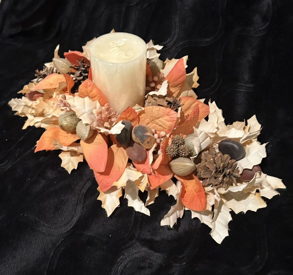 This beautiful centerpiece will go with any Fall, Harvest, or Thanksgiving Decor. The Candle in the picture is included.