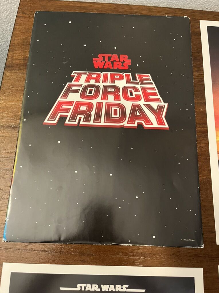 Star Wars Triple Force Friday Poster Set. This set was released in 2019 to celebrate new merchandise for Star Wars: The Rise of Skywalker, The Mandalorian, and Star Wars Jedi: Fallen Order.