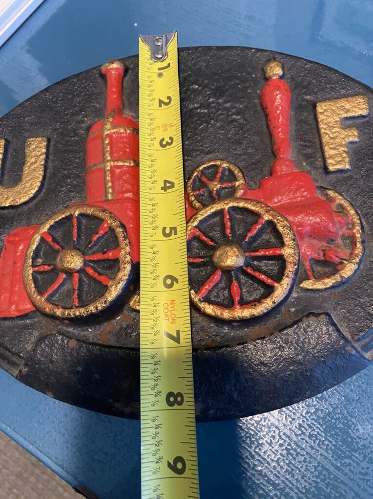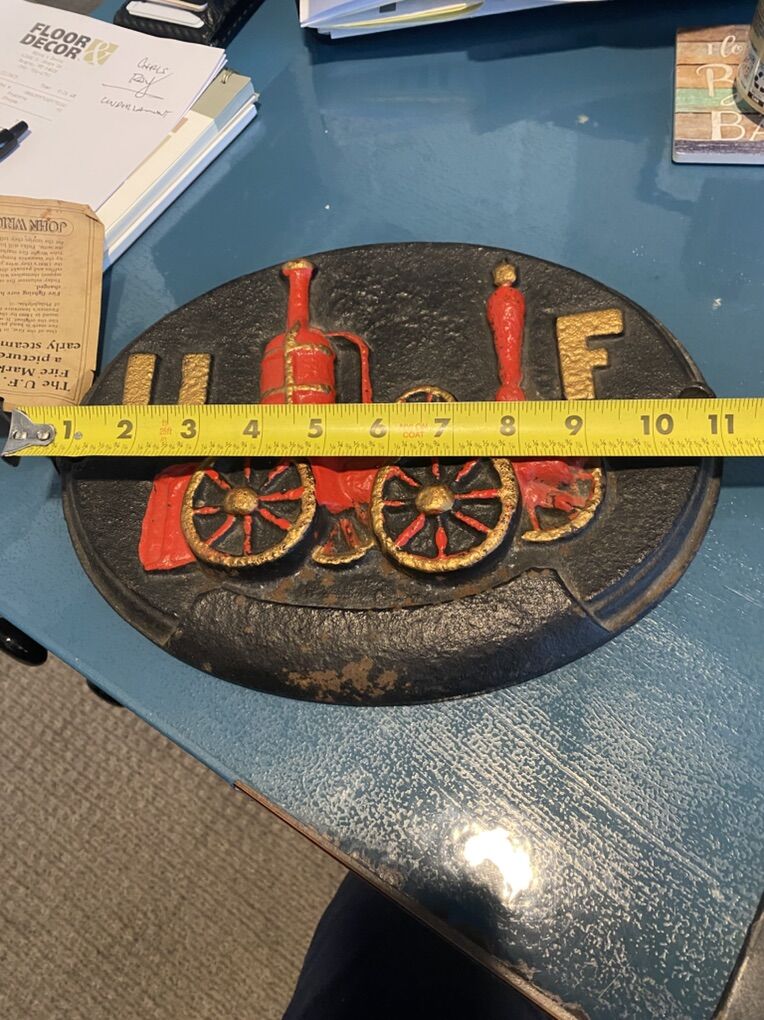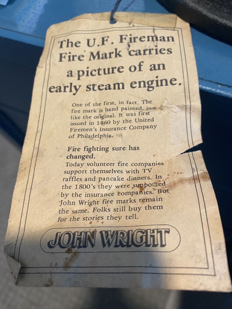 VenmoThis fire mark plaque features the letters UF (United Firefighters) and depicts an early steam fire engine. Fire marks were metal plaques affixed to buildings in the 18th and 19th centuries to show they were insured against fire by a particular company. The fire brigades would only extinguish fires in buildings displaying their company's mark.