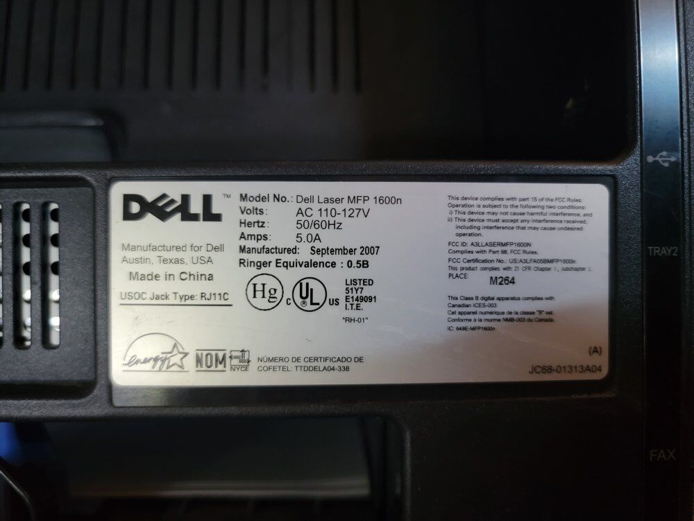 Dell Laser MFP 1600n. Laser printer / scanner / copy machine. It's older but still very functional Toner replaced a few years back and it's still at 89% left. Auto feeder for bigger scan or copy jobs. The hinges holding the scanner lid have snapped, so they don't prop the lid up, but this does not affect it's functionality. Documents can still be scanned automatically or manually. USB cable included. Great for Linux or Win 10. It still works with Win 11 but driver installation takes extra steps.