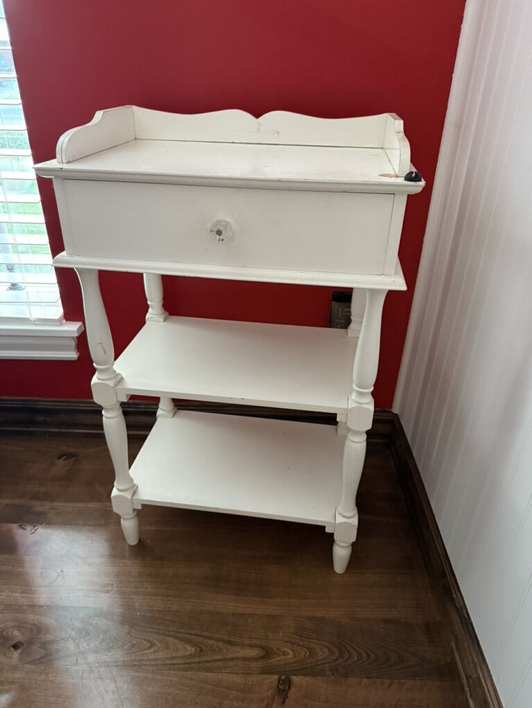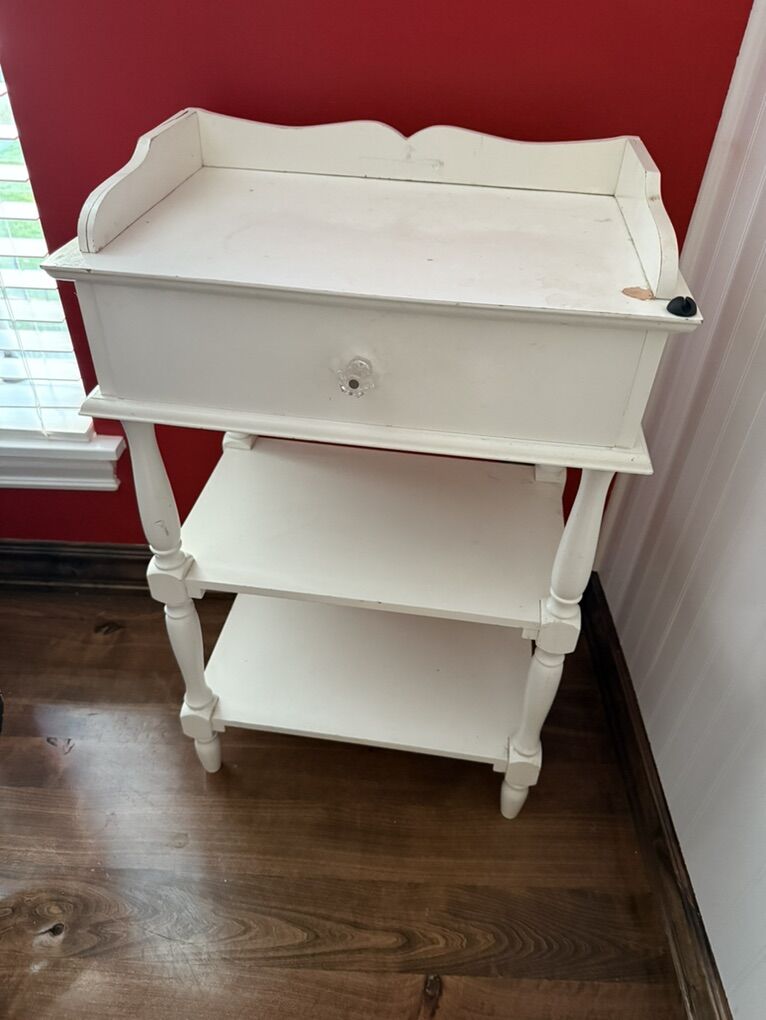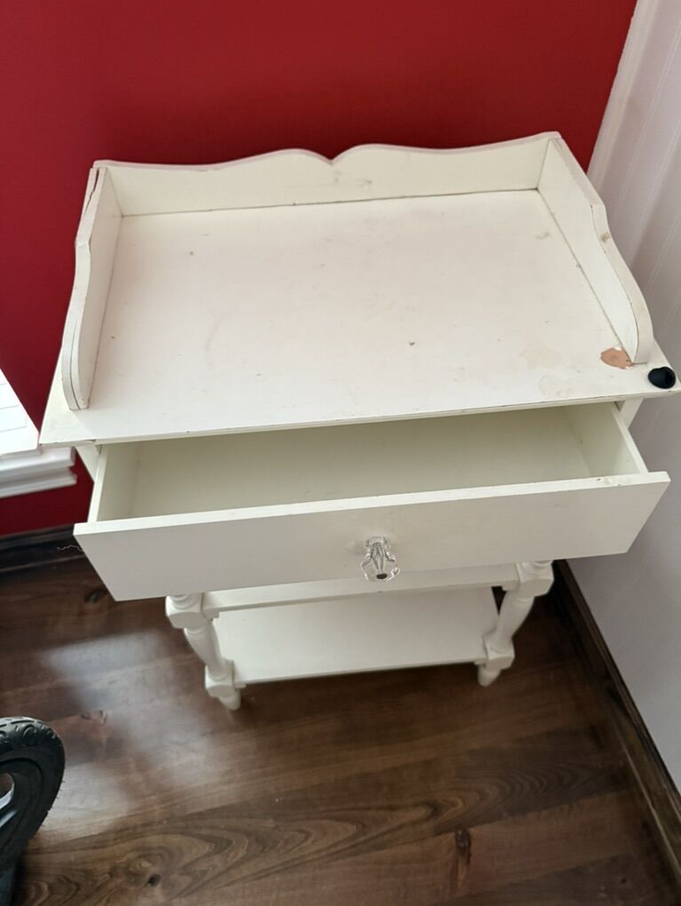 White nightstand with drawer 28” tall 12” deep 19” wide needs trim repair