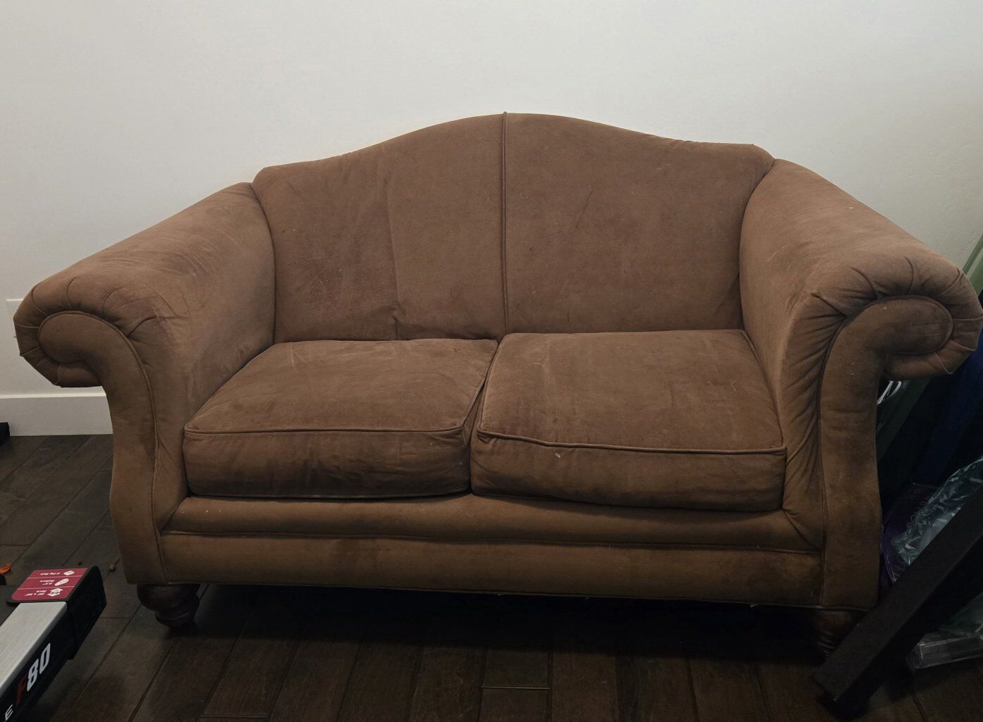 ZelleMatching sofa and love seat set with classic rolled arms and a distinctive curved/camelback-style back. The material is a brown microsuede $500/set.