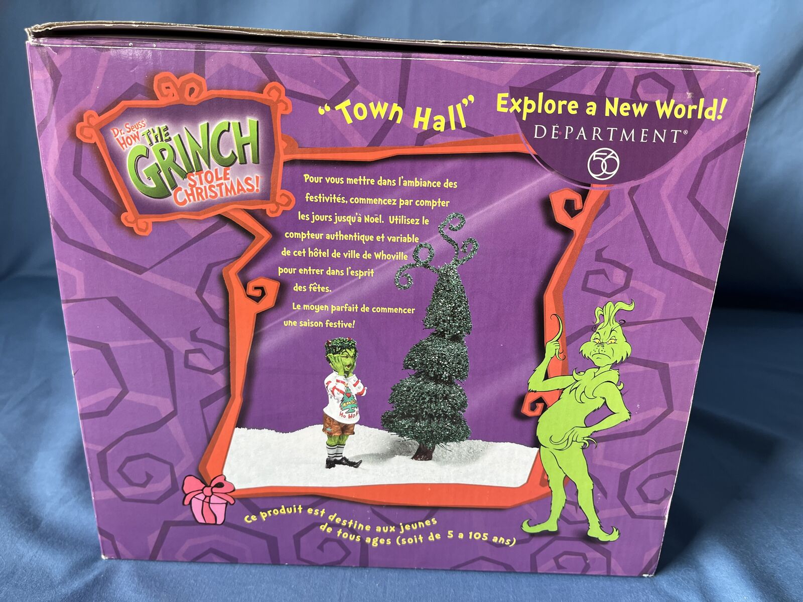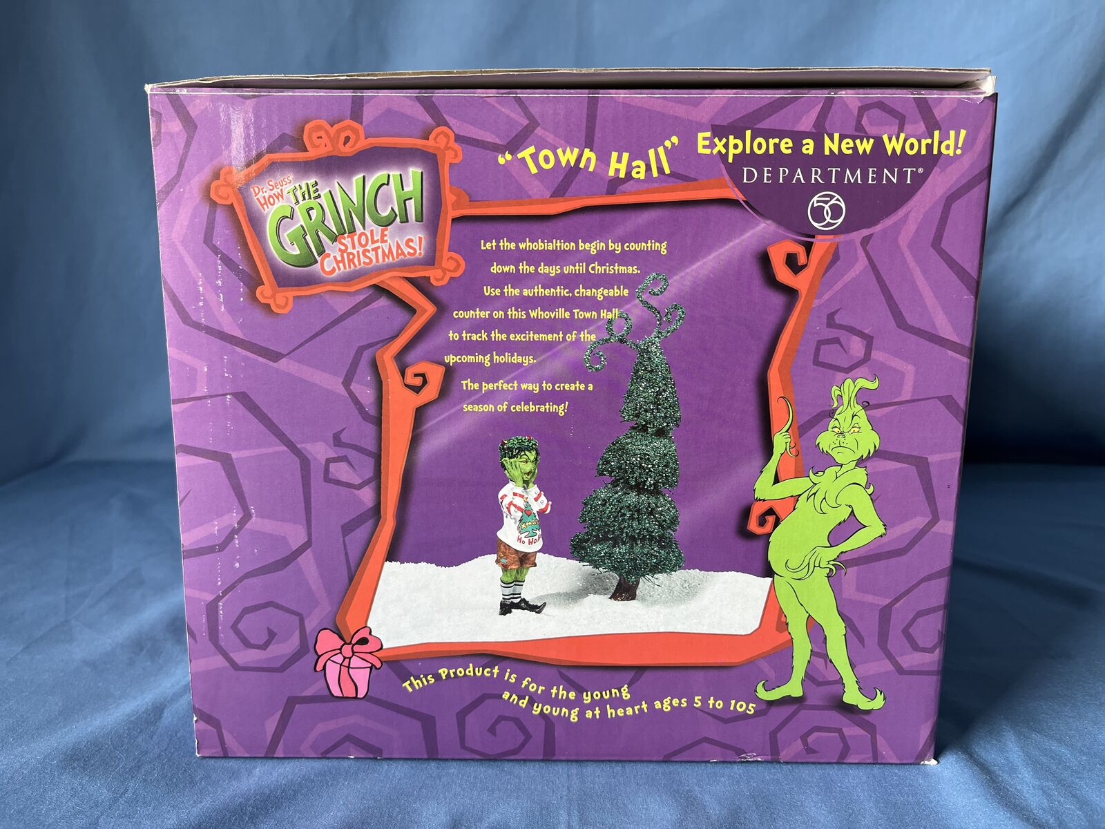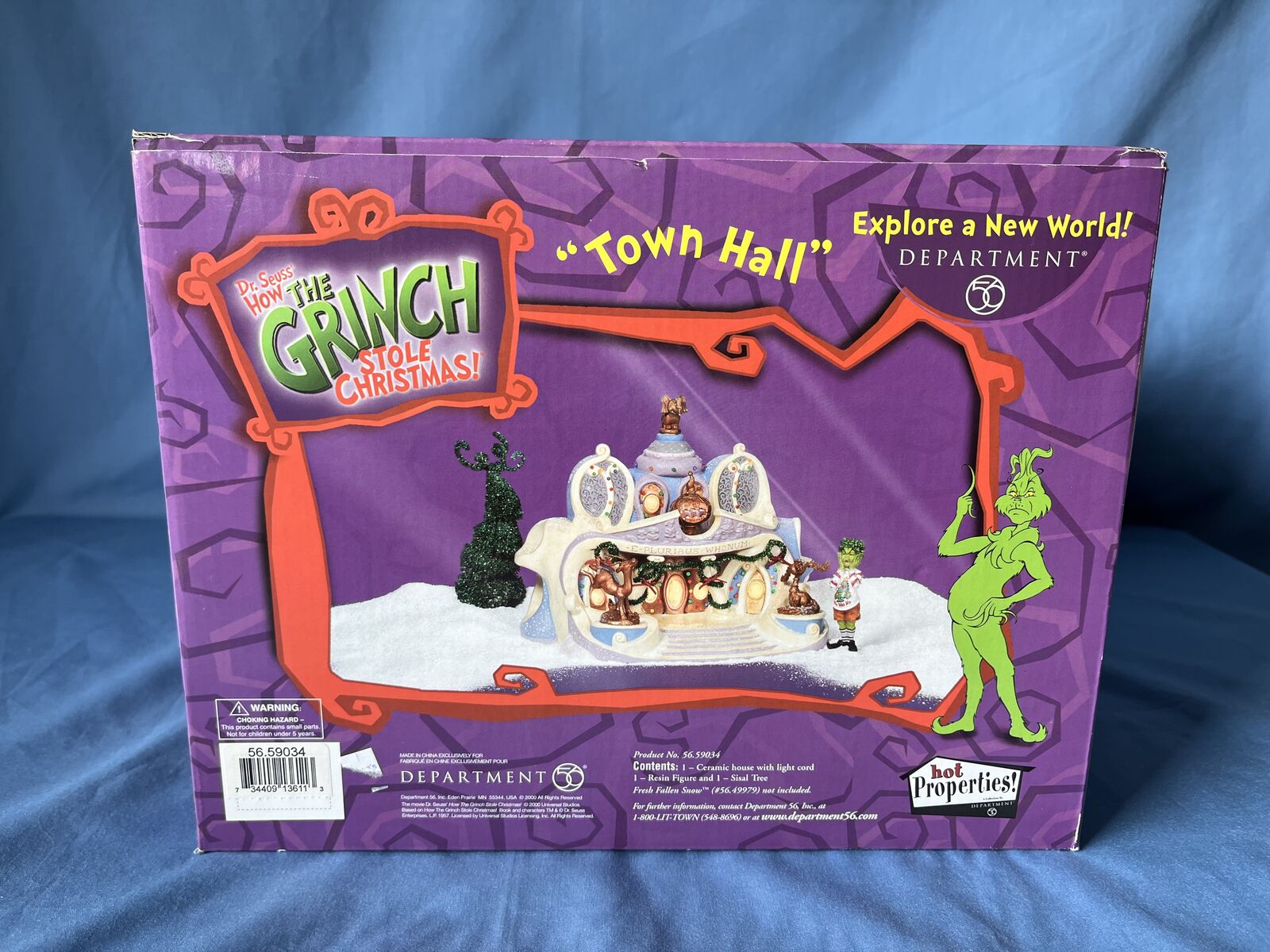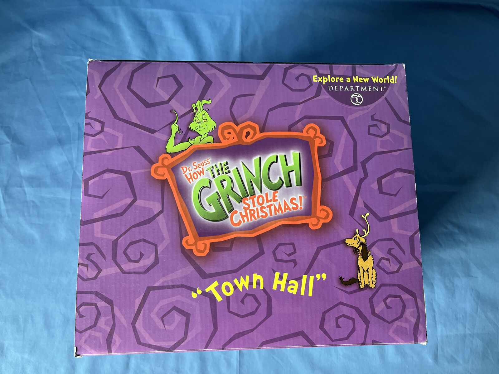 VenmoThis Town Hall is one of 3 Whoville buildings created by Department 56 based on those seen in the 2000 Live Action Movie. It is hand painted ceramic and includes the Whoville Town Hall, the Grinch figure and a wonky sisal tree. It has the original cord and light which work perfectly. This piece is in New condition..no chips, cracks, scratches, etc. It has only been out on display 3 times. The box and styrafoam are in really great condinion too. Dept. 56 retired this piece in 2003. It has been stored in a climate controlled closet in my non-smoking home.