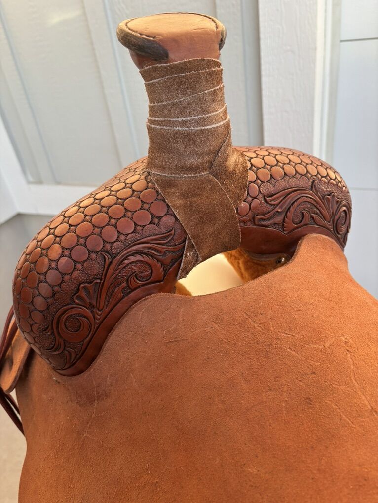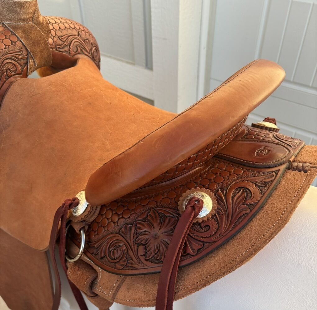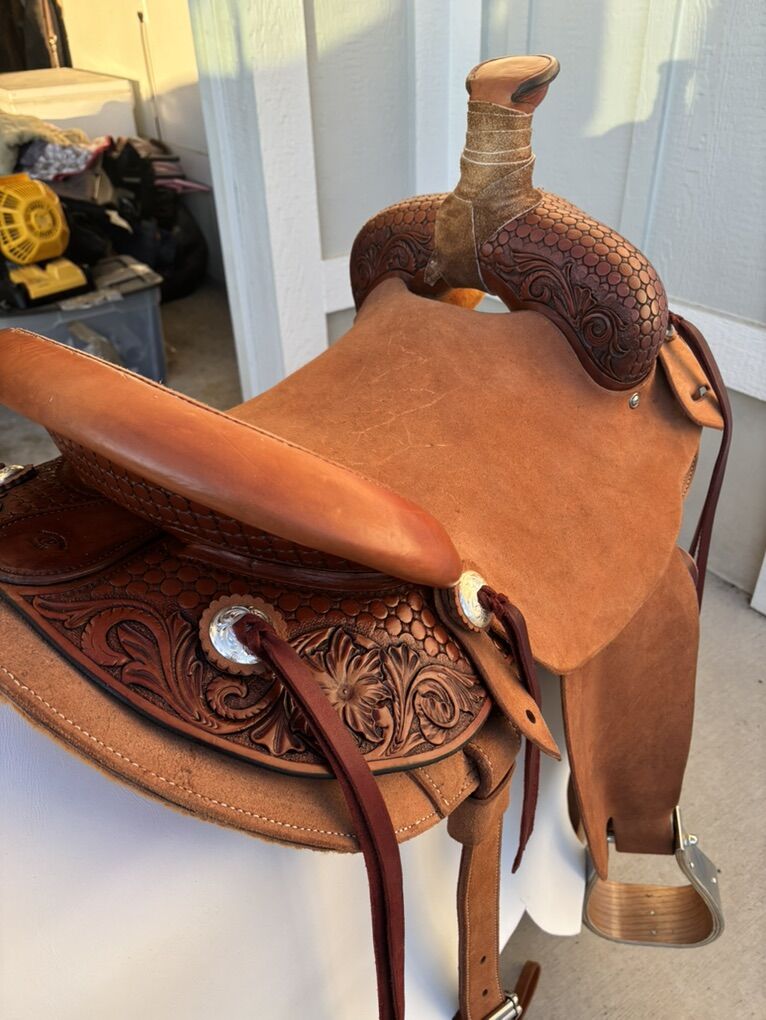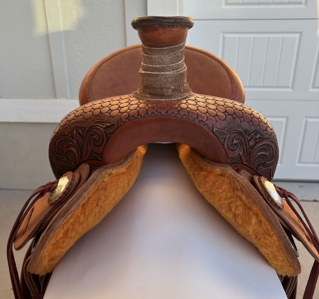VenmoDon’t miss out on the opportunity to have a hand made saddle without the years of waiting on a list. Rawhide covered tree Built on a semi quarter horse bars 15” seat Modified association tree #4 post dally horn Inskirt rigging with skirts blocked around tree to give your horses back a better fit with less pressure points Stirrup fenders with built in twist to reduce pressure on knees and ankles