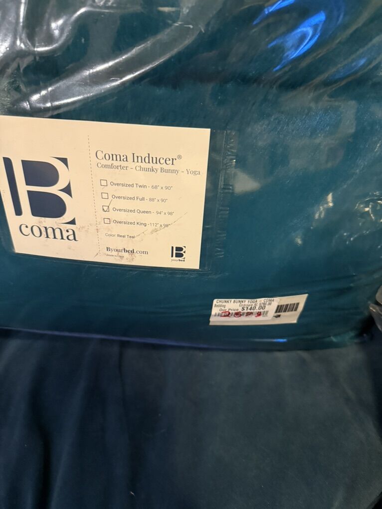 New in the packaging Bcoma Inducer comforter- chunky bunny- yoga. Blanket oversized queen 94x98 & 4 pillow cases retails for $280