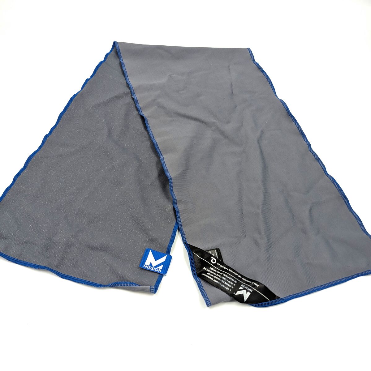 ZelleThe Mission Grey and Blue Sweat Towel is a never-used gym towel designed for use during gym and training activities. Made by the brand Mission, this towel is machine washable and features a stylish gray color. Perfect for wiping away sweat and moisture during workouts, this towel is a convenient and essential accessory for fitness enthusiasts.