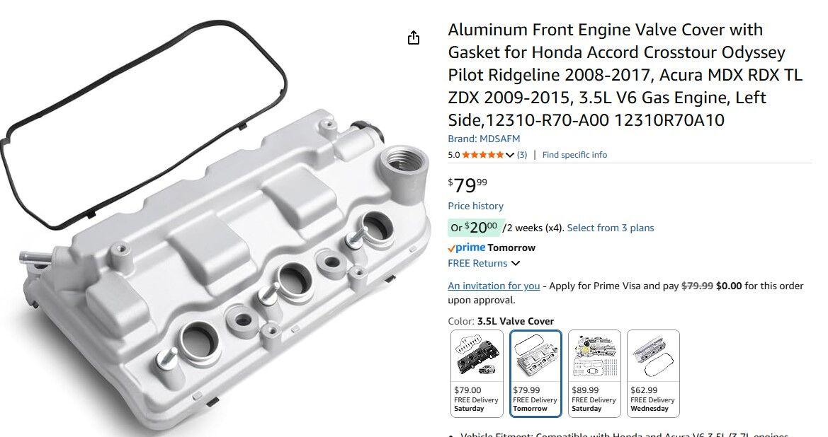 Vehicle Fitment: Compatible with Honda and Acura V6 3.5L/3.7L engines, including: for 2008-2012 Honda Accord, for 2010-2011 Honda Accord Crosstour, for 2012 Honda Crosstour, for 2008-2017 Honda Odyssey, for 2009-2015 Honda Pilot, for 2009-2014 Honda Ridgeline, for 2013-2015 Acura RDX, for 2010-2014 Acura TL, for 2010-2013 Acura ZDX, Cross-check part numbers 12310R70A00 and 12310R70A10 for compatibility