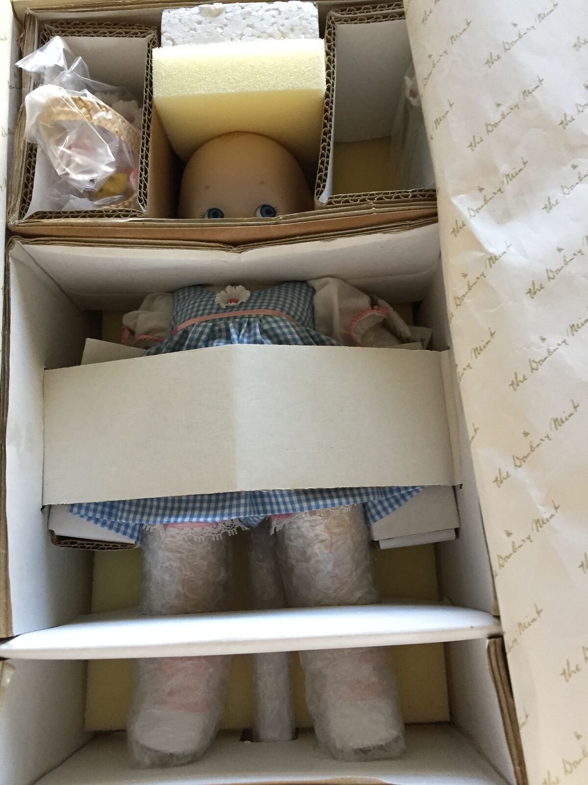 The Darling Kewpie Porcelain Danbury Mint Collector Doll is a beautifully crafted 12" tall doll with a blue and white checkered dress. Made of high-quality porcelain, this original blue-eyed Kewpie doll is a collectors' item from 1997.