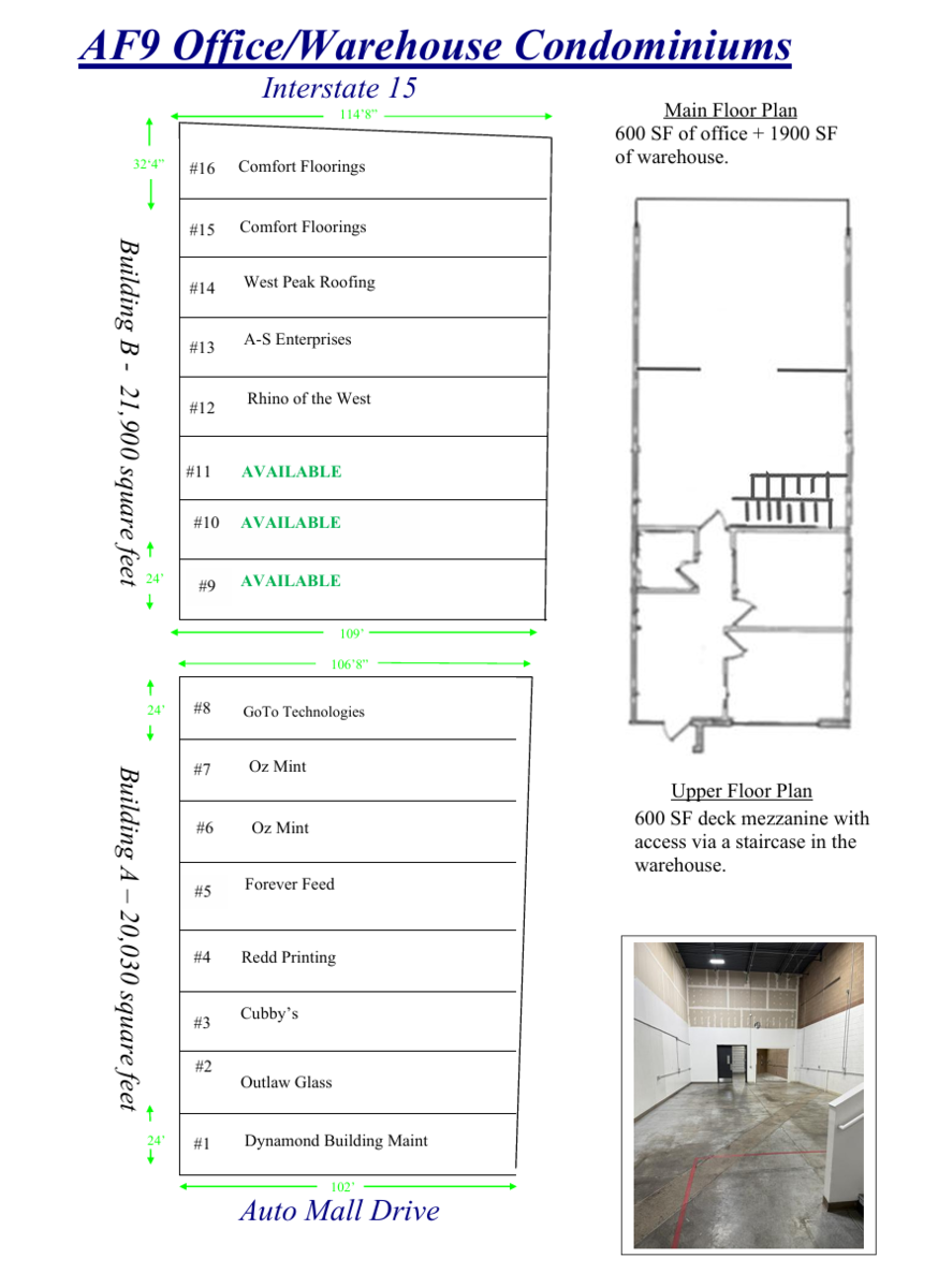 3100 SF of office/warehouse available for lease January 1st, 2026. This unit has 600 SF of clean office space including two private offices, a private restroom, and a reception area. The warehouse is 1900 SF and includes heat, lights, outlets, a man door, and a 12' x 12' overhead garage door. In addition there is 600 SF of storage on a second level accessed through a staircase in the warehouse. The rent is $4700 per month including Landlord paying all fees except utilities. Can be combined with adjacent units for additional SF. Call today to schedule a showing!