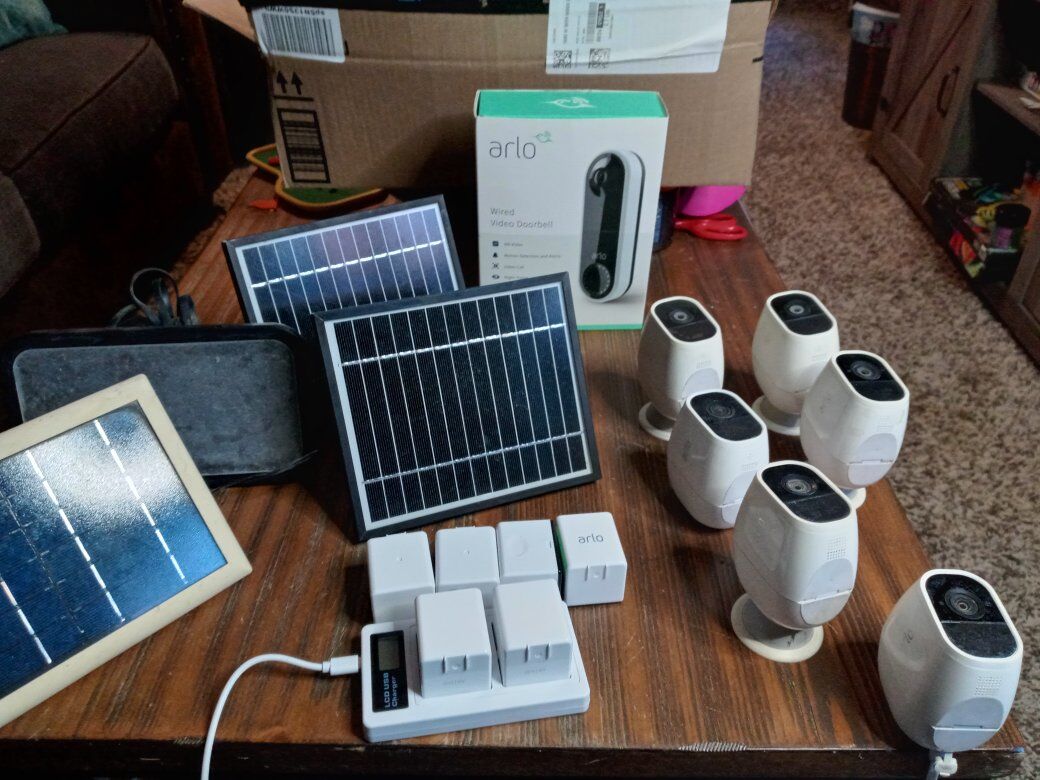 CashAppinclude 6 cameras with 4 solar chargers 6 extra batteries fir the cameras so 12 batteries total with a arlo doorbell a duel charger and a single charger as well and also the hung it in the picture but I do have it in asking 300$