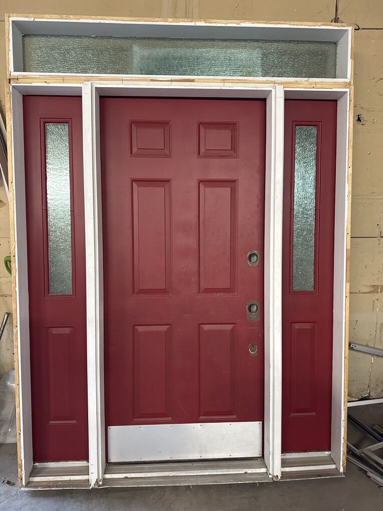 VenmoSize as a complete door unit measuring outside of jamb with side lights and transom the size is 68 1/4 x 93 1/4 Jamb size 6 9/16 swings into the left if you’re standing from outside. The size of the swinging door in the middle is 35 1/2 The door is in great shape. I believe it’s an old peach tree. It’s a steel door with wood jams, cash, or Venmo only.