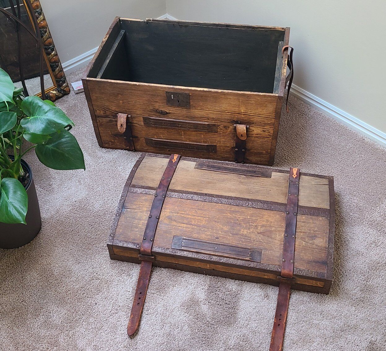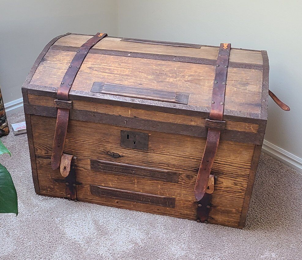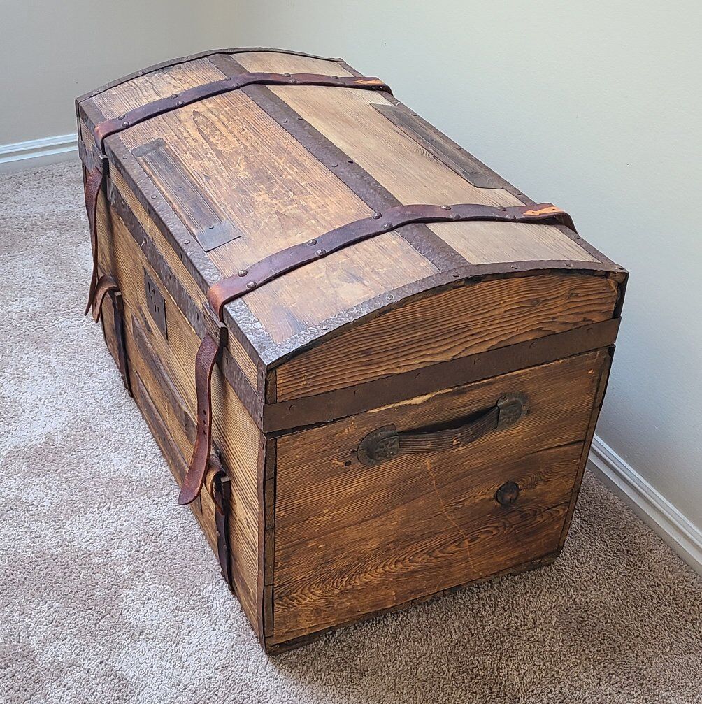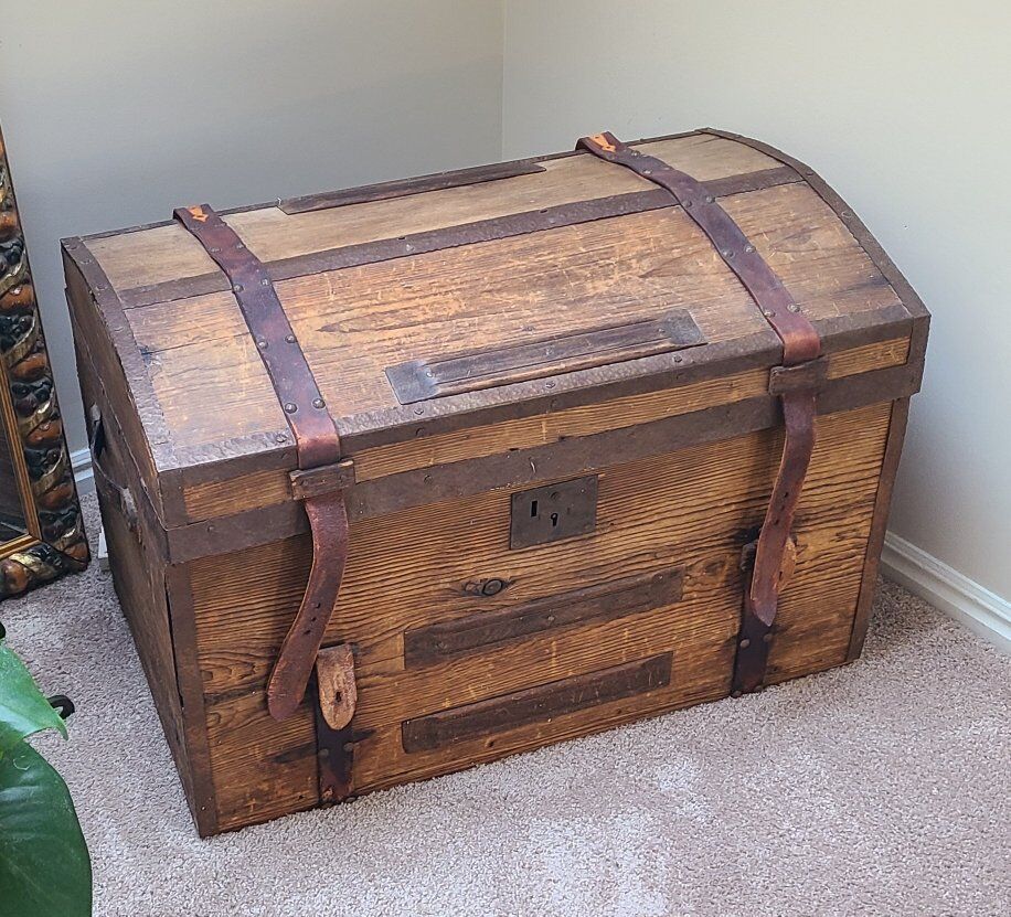 I believe it is an antique French trunk. The hinges are missing but I like that the top lifts off because tjen it won't dent my walls. There is a wood tray insert that is included too. The side handles are intact and sturdy.