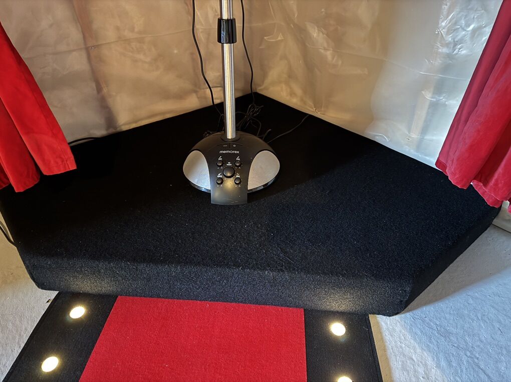 Stage With Drapes, Microphone stand with 2 microphones included And LED Rug with different LED settings.