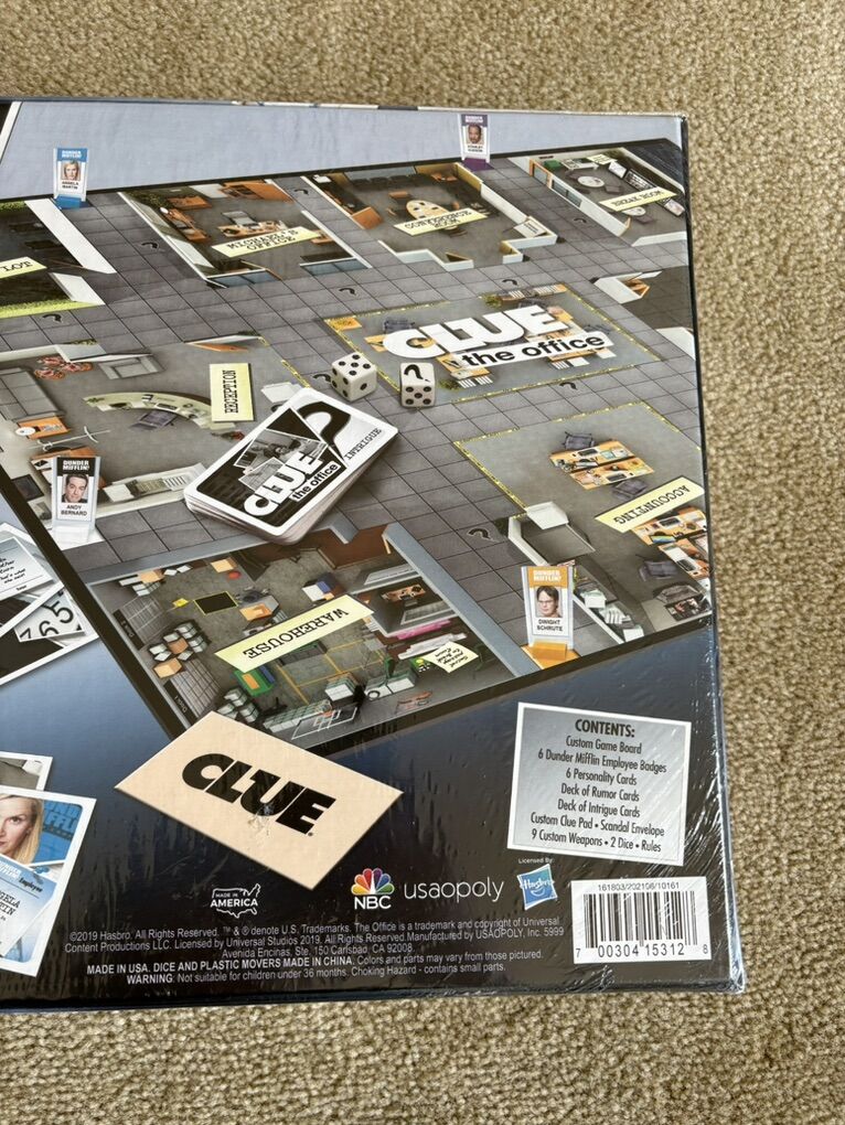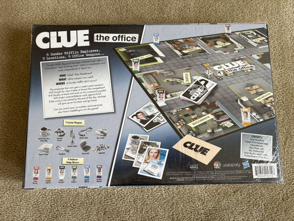 NEW (sealed in plastic) Clue: The Office Edition. Discover the secrets of Dunder Mifflin, Scranton. Ages 9+, 3-6 players. Hasbro, USAopoly, 2019. New, unopened condition. Text only. Cash or Venmo.