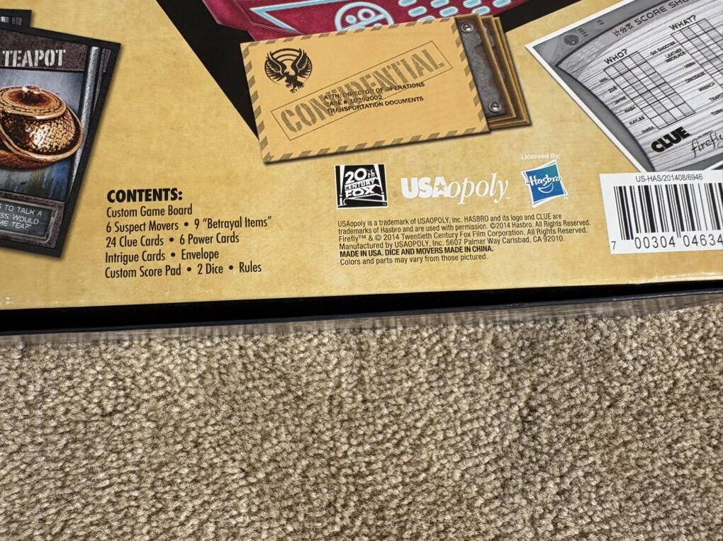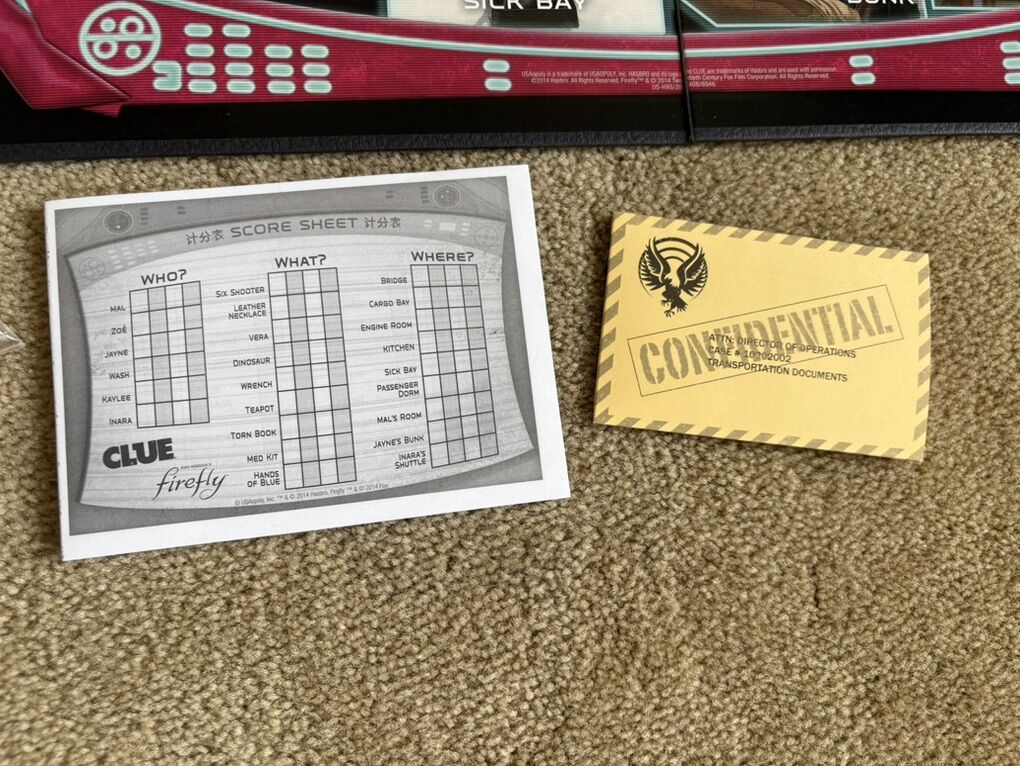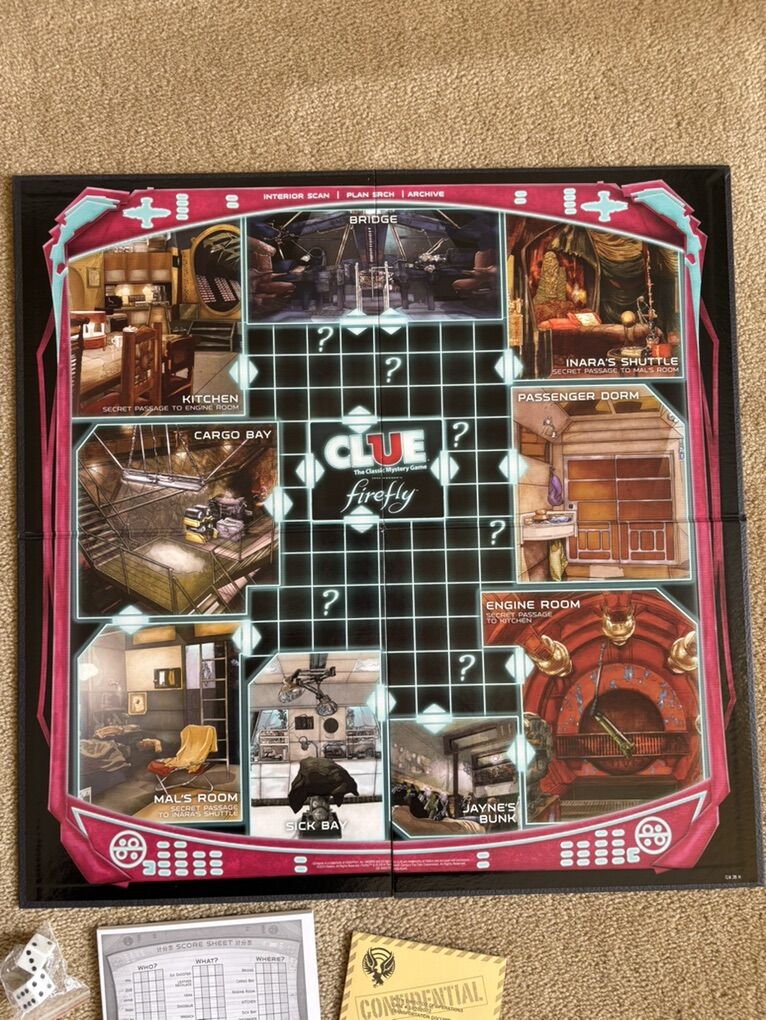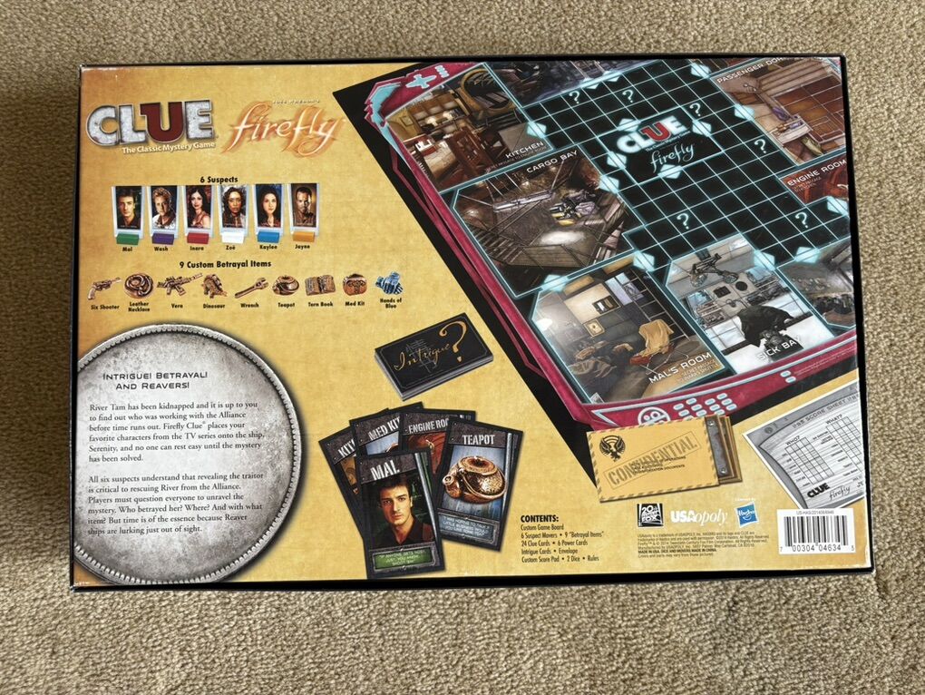 NEW/COMPLETE (open box, sealed components) Clue: Joss Whedon’s Firefly Edition. The classic mystery game. Ages 8+, 2-6 players. Hasbro, USAopoly, 2014. Complete, no missing pieces, most components sealed/unused. Text only. Cash or Venmo.