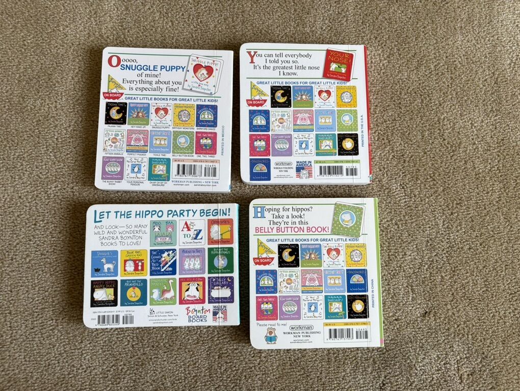 Four Sandra Boynton Board Books, Set 1: Snuggle Puppy!; Your Nose!; Hippos Go Berserk!; and Belly Button Book!. Good condition, slight wear on edges. Text only. Cash or Venmo.
