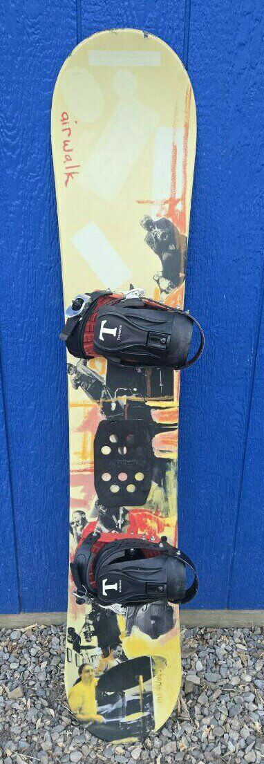 This snowboard is in great condition. It is a 161 cm Airwalk Champ Snowboard with Technine bindings. Nice colorful Jazz and music graphics on front of board and Airwalk logo on the bottom. Text please!