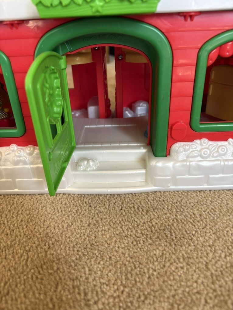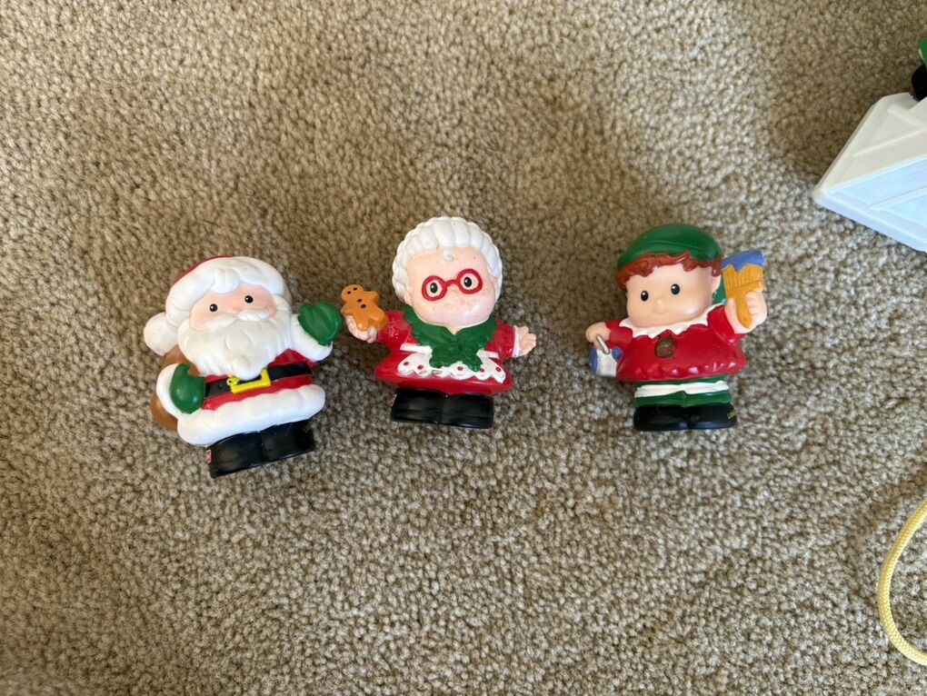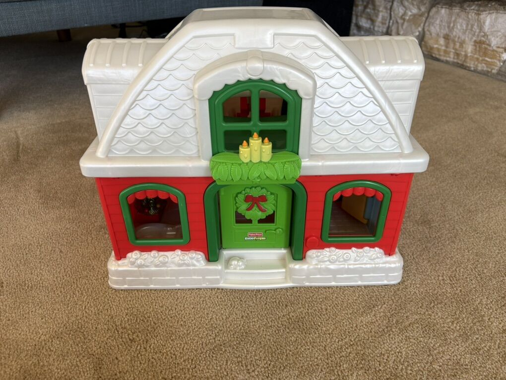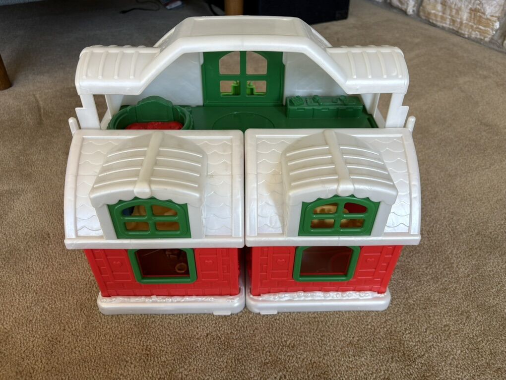 RARE Fisher-Price Little People Santa's North Pole Cottage set. Includes fold-up house in excellent condition, with built-in furniture and sounds. Also includes Santa Claus, Mrs. Claus, elf, and 3-car Christmas train. All in very good condition. Text only. Cash or Venmo. Discount on multiple items.