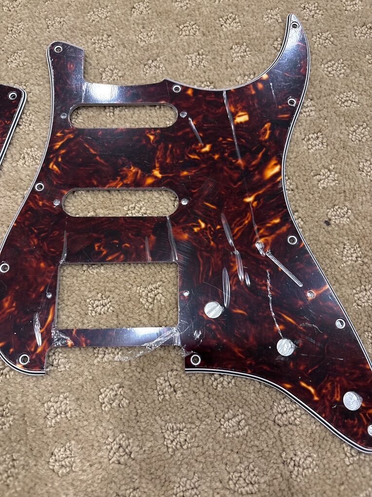 VenmoS S H Fender Strat pick-guard. This fits my maid in Mexico with three knobs. Still has the plastic on it. I will also include a cream colored Picard, which is used.