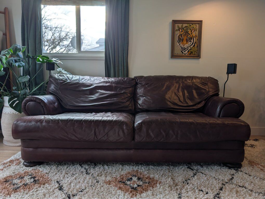 Super comfortable. It has a few light scratches but should come out with some oil or leather conditioner. 86" x 32"