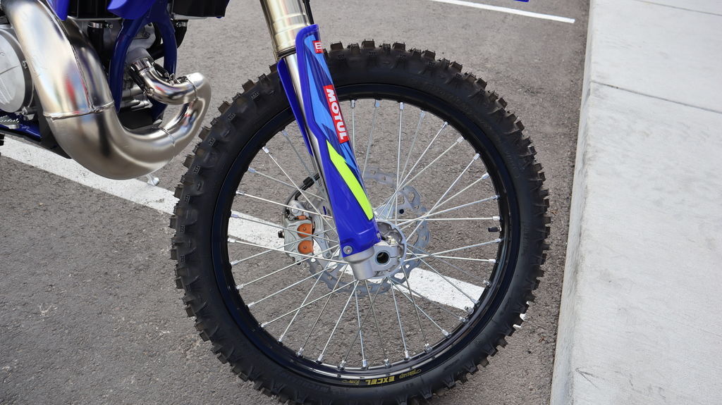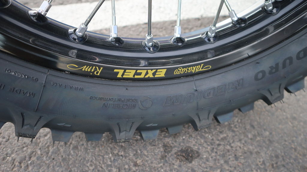 Brembo hydraulic brakes with Galfer discs, 260mm front and 220mm rear. Black Excel wheels paired with Michelin Enduro Medium tires for optimal traction and control.