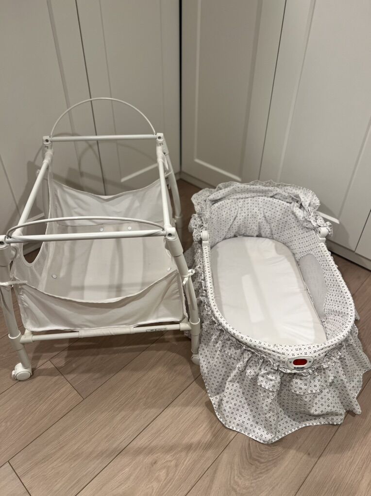 Oval shaped baby bassinet with storage space below. The bassinet can separate from the base. It also has wheels to move around easily and an adjustable cover.