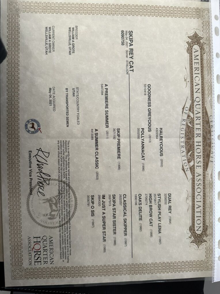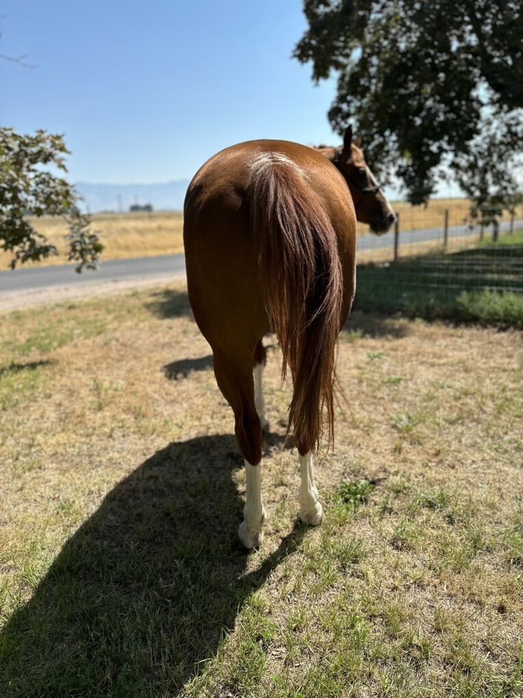Stunning Sorrel Rabicano AQHA gelding, 4 years old, standing approximately 15–15.2 hands and weighing around 1,000 lbs. He is Dual Rey and Skipper W bred, with athleticism, cow sense, and speed bred deep into his pedigree. Registered AQHA and eligible for possible APHA dual registration.