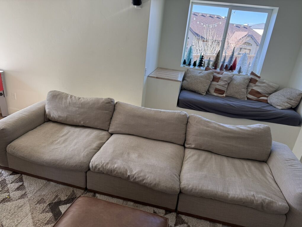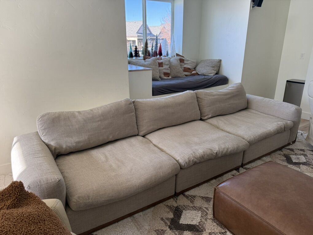 VenmoThis comfortable modern couch features soft beige/cream upholstery with a quilted faux-leather base that adds a nice warm contrast. Back and seat cushions are plush, supportive, and removable for easy cleaning. The sofa has a neutral, versatile look that fits well with most any decor including boho, modern, western and transitional. 140” long 41” deep couch