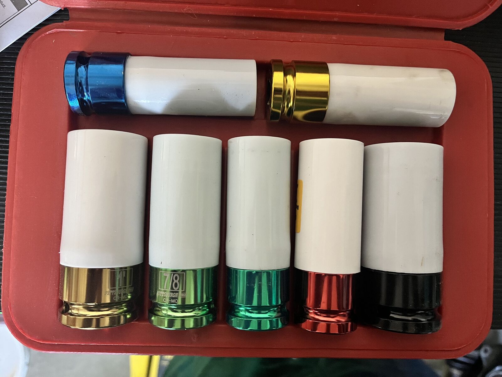 ApplePayPittsburgh 1/2 lug nut impact socket set. Includes 1 1/16, 1, 7/8, 13/16, 21mm, 19mm, and 17mm. I only ever used the 21mm socket which has been replaced. Includes a carrying case.