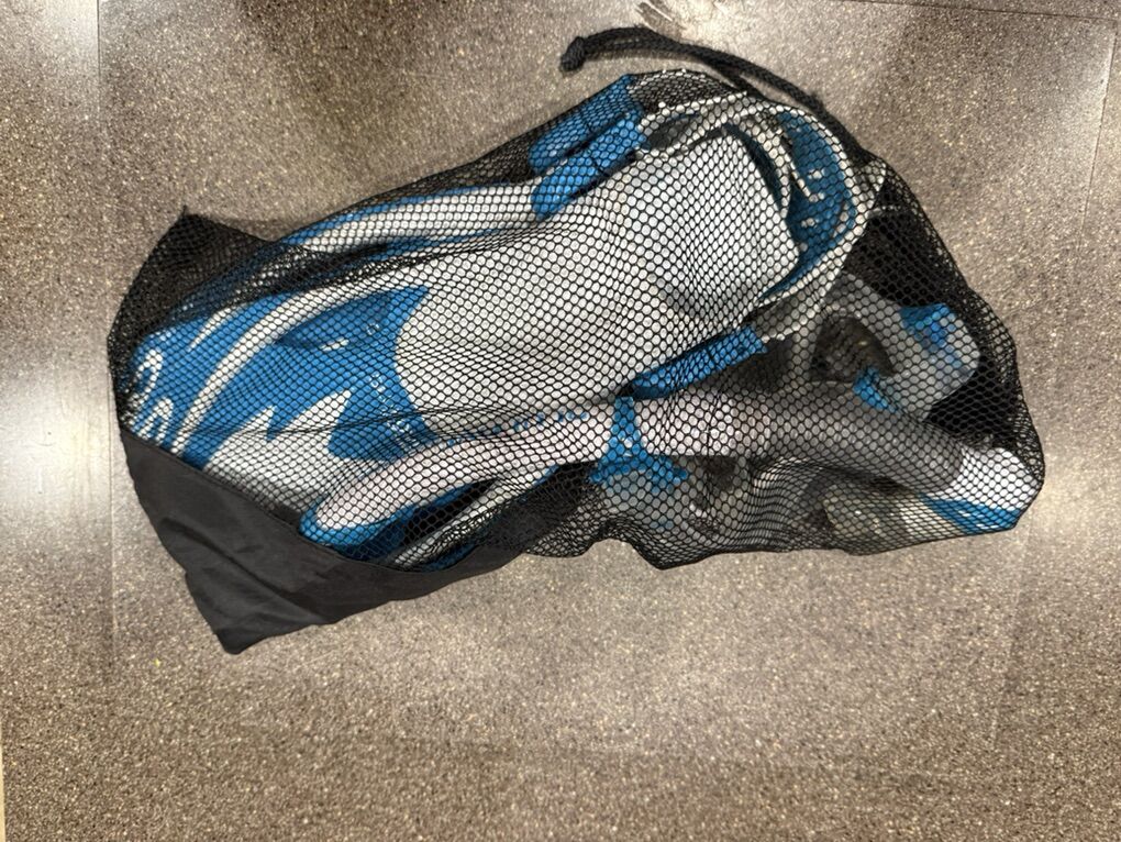 The set includes stylish, colored short fins with adjustable straps for a comfortable fit. In the box: mask, snorkel, pair of fins, net bag.