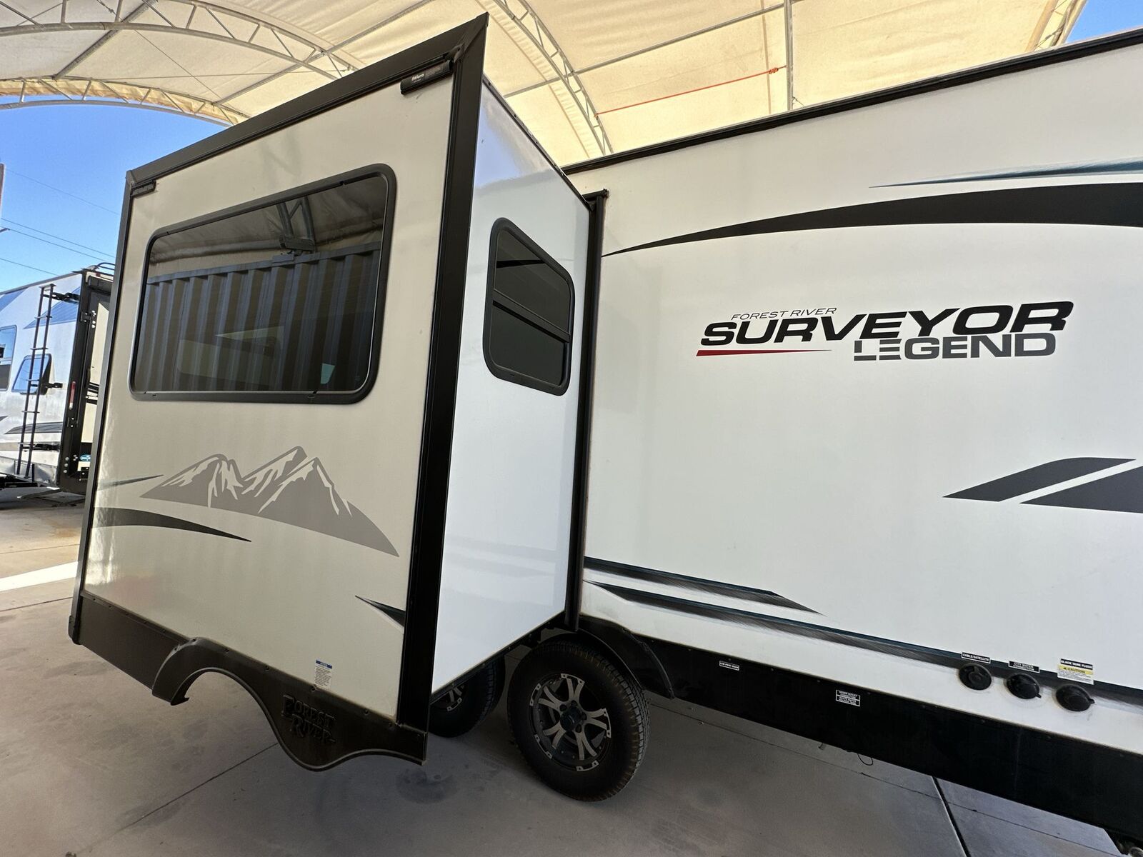 Forest River Surveyor Legend travel trailer 202RBLE highlights: Outside Kitchen Pass-Through Storage Panoramic Window Full Bath Decorative Art You're going to love every minute spent in this 25' travel trailer! The counter with stoolswill be the perfect place to enjoy your morning coffee at, plus there is a dinette slide for more seating space. You will get a great night's rest on the queen bed in the front bedroom, and the two wardrobes allow you to keep your clothes tidy. Further customize this trailer by adding the theater seating option or tri-fold sofa option in place of the dinette, and you'll enjoy the standard HD LED TV for late-night movies! With any Surveyor Legend travel trailer by Forest River you will enjoy quality craftsmanship, convenient amenities, and at-home comforts. The Azdel composite panels provide a longer-lasting trailer, and the power tongue jack will get you back on the road in no-time. Each model includes the Surveyor Legend Package that comes standard with pleated night shades, an automotive style tinted front windshield, a multi-zone Bluetooth stereo, and more. You'll enjoy the one-touch electric awning with LED lights outdoors, plus rooftop solar prep and rear camera prep to make parking easier than ever. The inside will have you feeling right at home with Surf(x) seamless countertops, Congoleum designer carefree linoleum, residential faucets in the bath and kitchen, plus many more essentials you won't want to camp without.