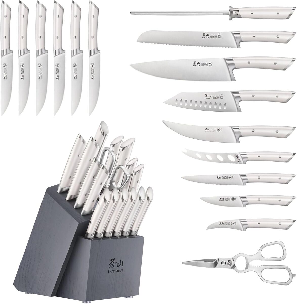 We have two of these Cangshan OLYMPUS Series 17-Piece Knife Block Set, German Steel, Gray Wood Block (White) 1759346 #104338 available. These knife sets have been lightly used and come in the original boxes.