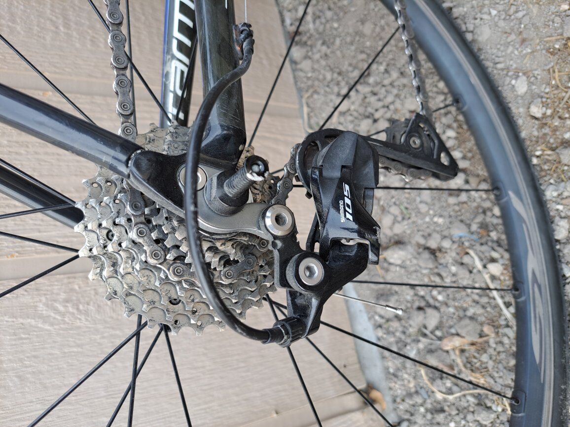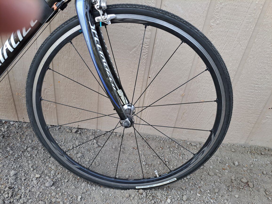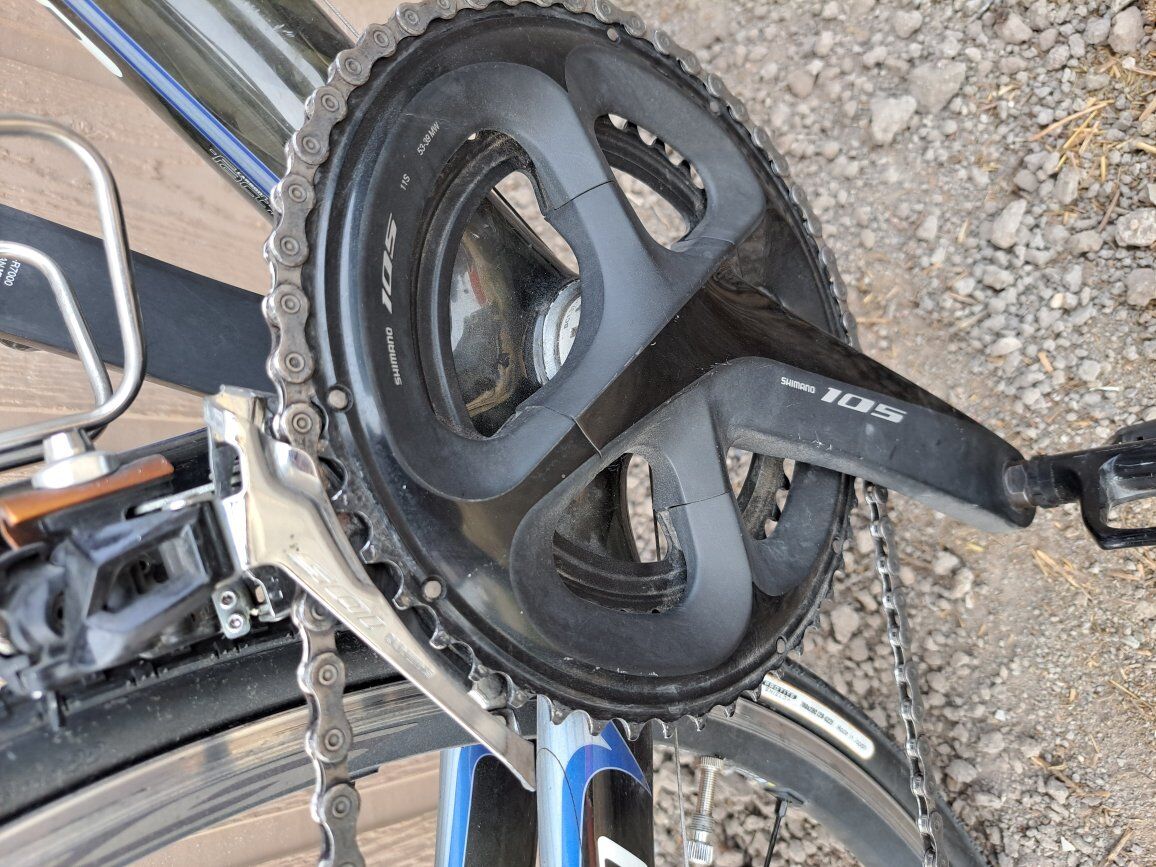 Full carbon bike including shock absorption seat post. Large 56cm frame. Very light weight and smooth gliding. 9 x 2 gearing. Just recently had a tune-up. New brake pads and tires. Currently has tubeless gravel tires to avoid flats and get more mileage from the tires. Full seat bag and frame bag included.