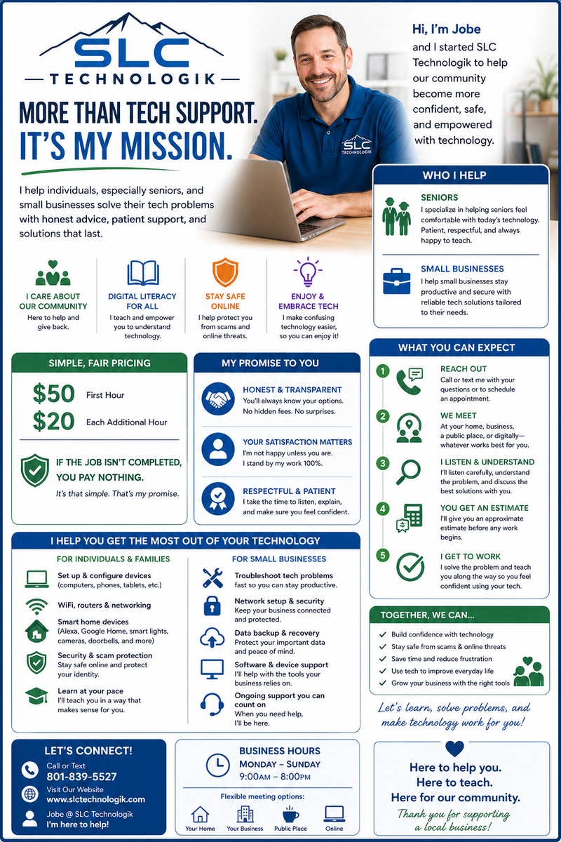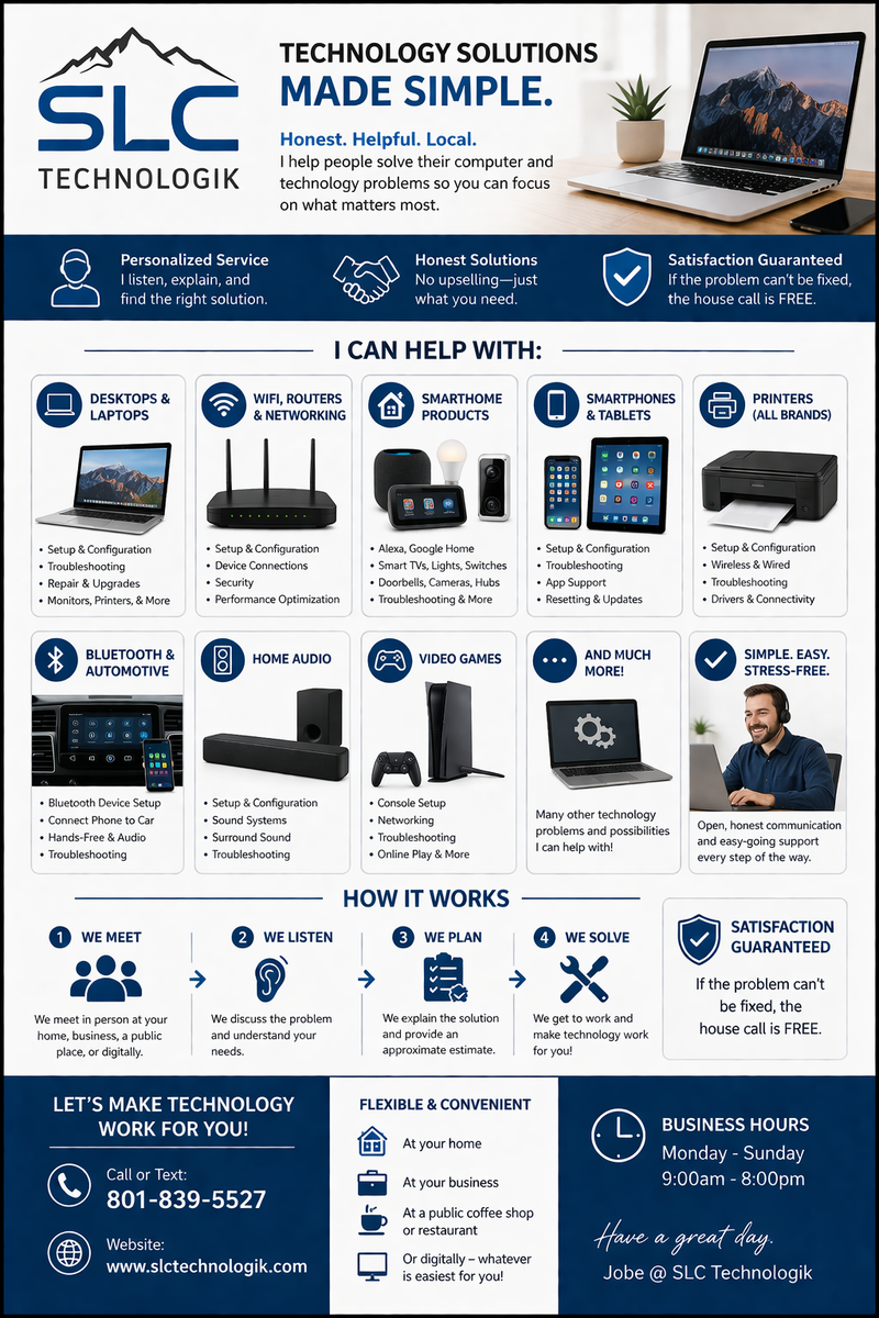 Hello, my names Jobe with SLC Technologic and I love to work to help people solve their various computer and technology problems. Here at SLC Technologic I work hard to give my customers honest and helpful solutions to their various tech issues.