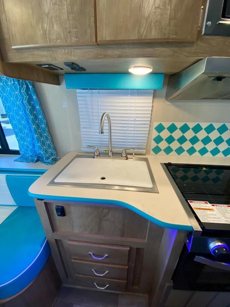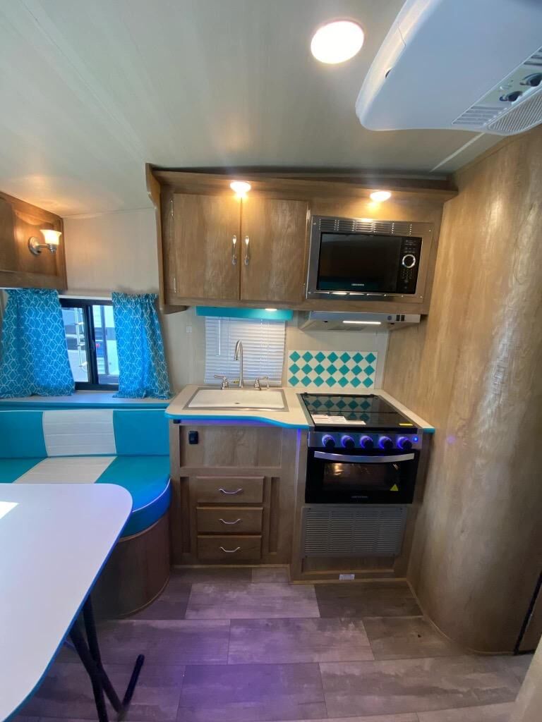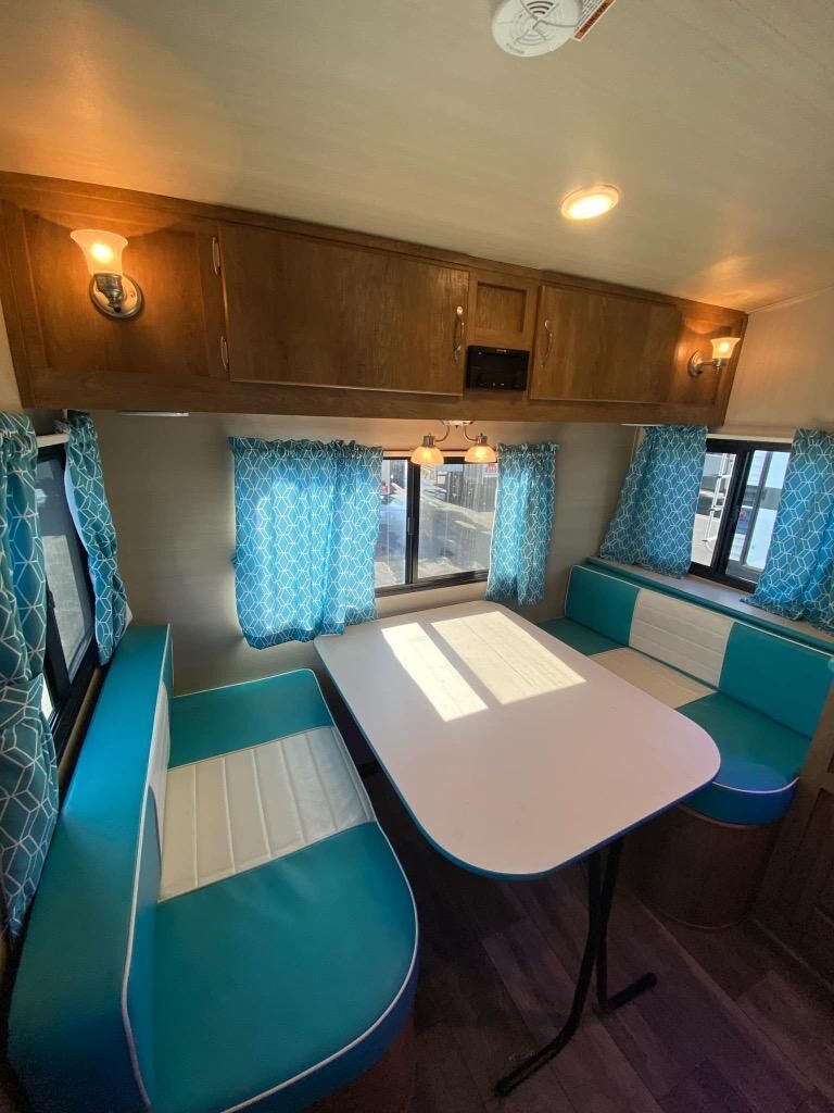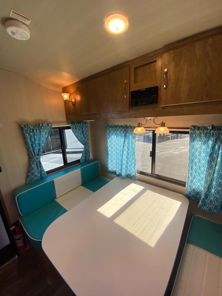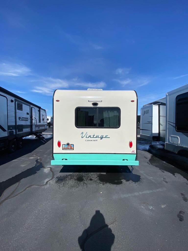 If you enjoy a more classic look for an RV, you'll love this Vintage Cruiser 19ERD. The rear booth dinette is surrounded by windows for bright, open views, and you'll find overhead storage here for dry goods or snacks. The chef of your group will have a two burner cooktop and a microwave oven to prepare meals, and you may want to add an optional 19" LED HDTV to keep your guests busy at the dinette while dinner is being made. The private toilet and sink is right across the hall from the 24" x 36" shower so two people can freshen up at once. How convenient! This model also features a semi-private front bedroom with a privacy curtain for your own space, plus an RV queen bed and dual shirt closets to keep your clothes tidy!